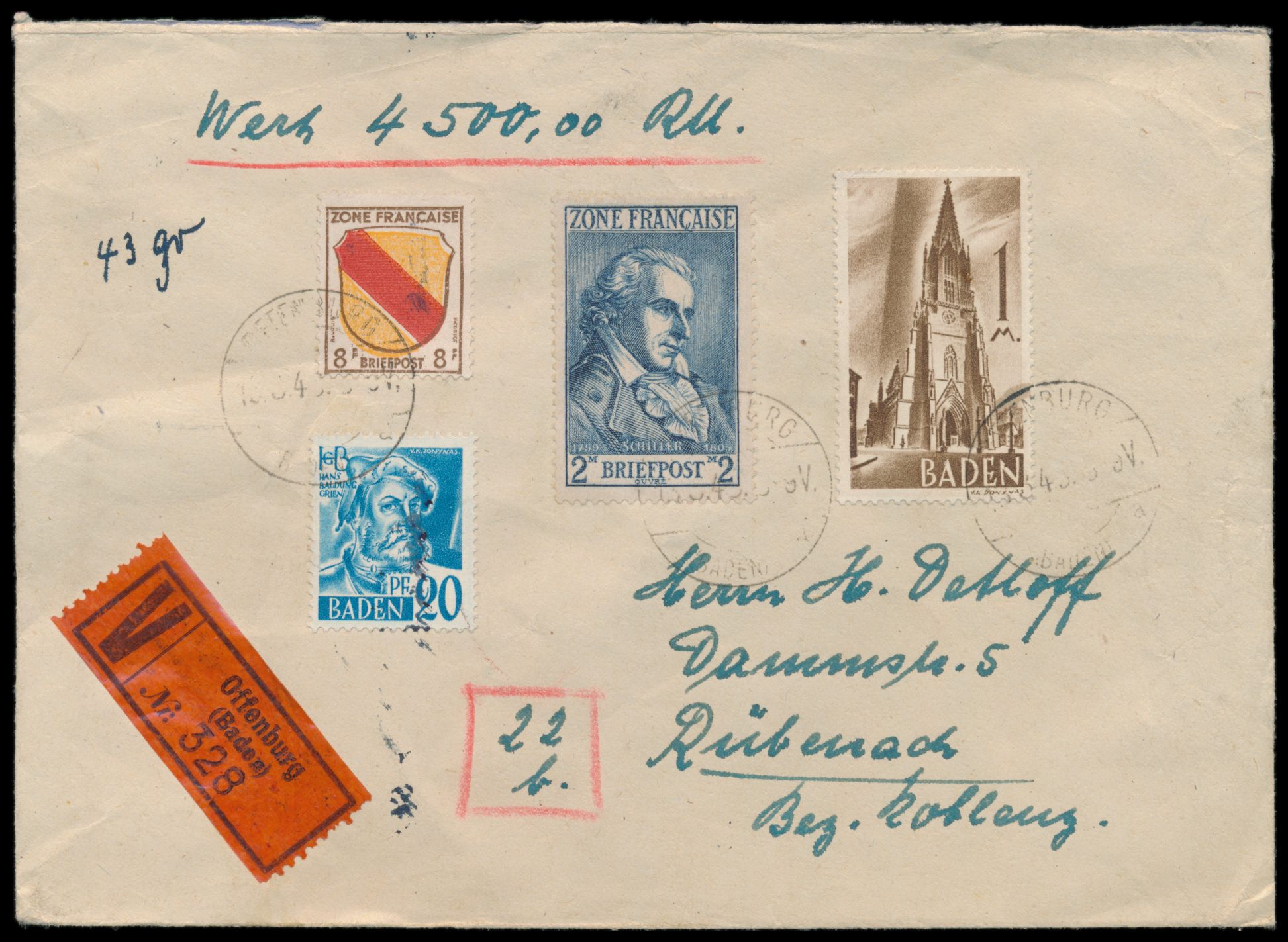 Allgemeine Ausgabe 8 Pf. und 2 Mark Schiller mit Baden 20 Pf. und 1 Mark auf Wertbrief, Wertangabe 4500 RM, Gewicht 43 gr., Stempel Offenburg (Baden) 13.3.48, nach Rübenach, Ankunftstempel 15.3.48, portorichtig