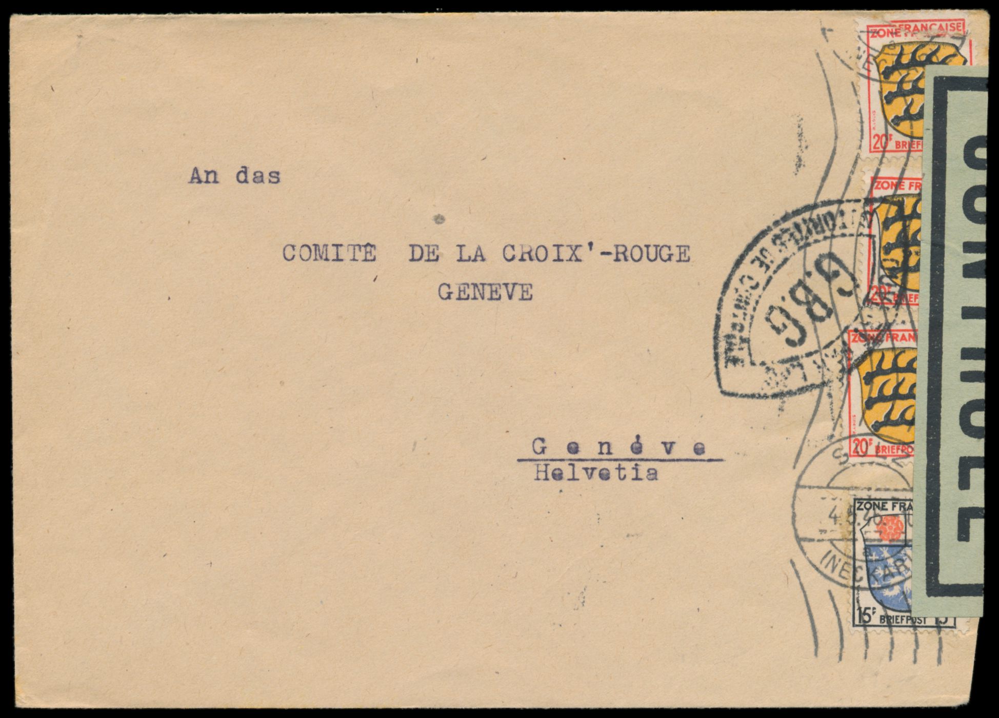 Zensurstelle Tübingen, Auslandsbrief mit Allgemeine Ausgabe 15 Pf. und 3 x 20 Pf. (eine Marke beschädigt) in die Schweiz, Handrollstempel Sulz (Neckar) 4.5.46, rechts grüner Verschlußzettel Controlé mit Rahmen (Handbuch Typ 22) und beidseitig schwarzer Doppelspitzovalstempel Ouvert ... G.B.G. , rückseitig grüner Prüferstempel 554, Bedarf