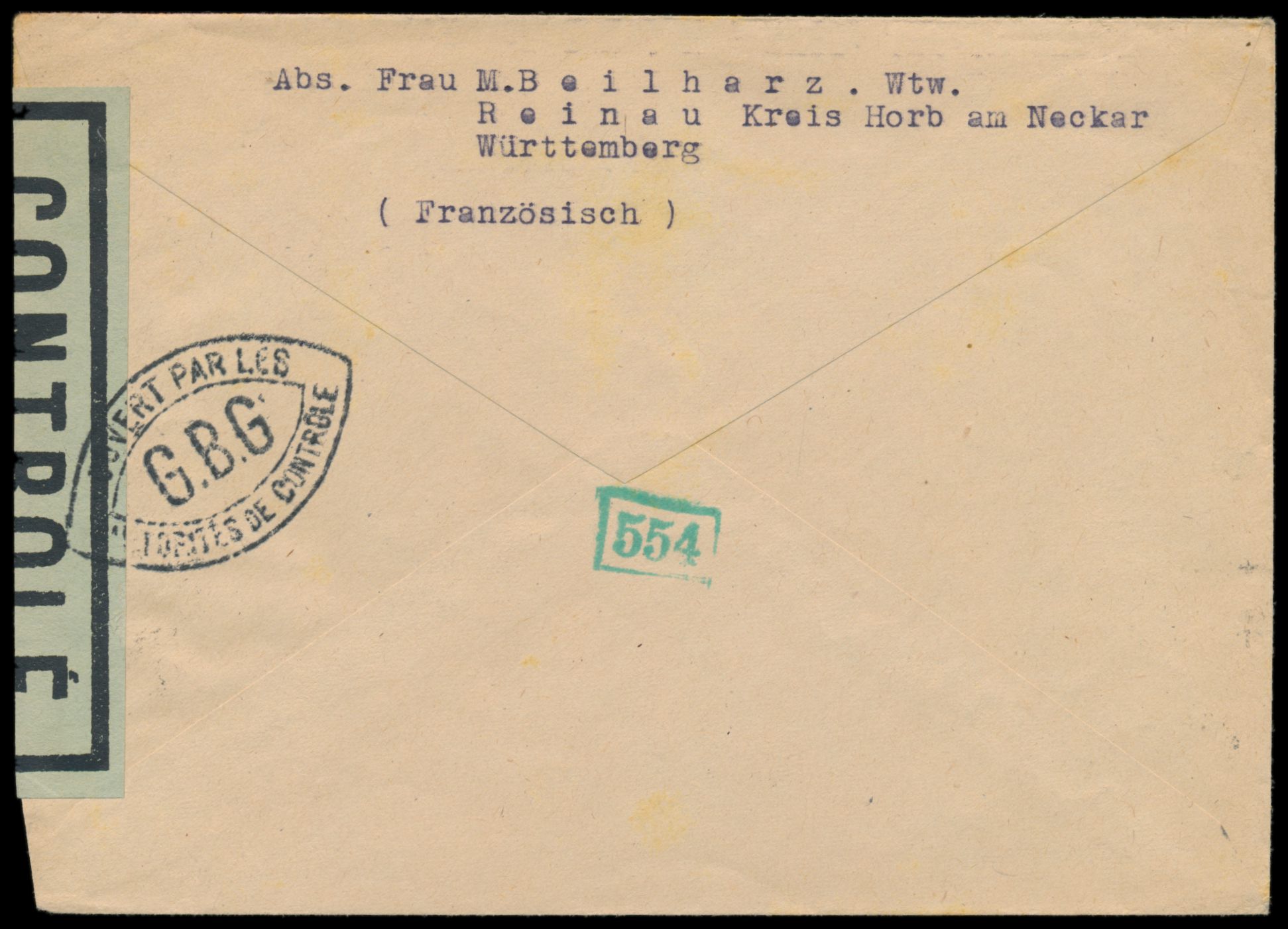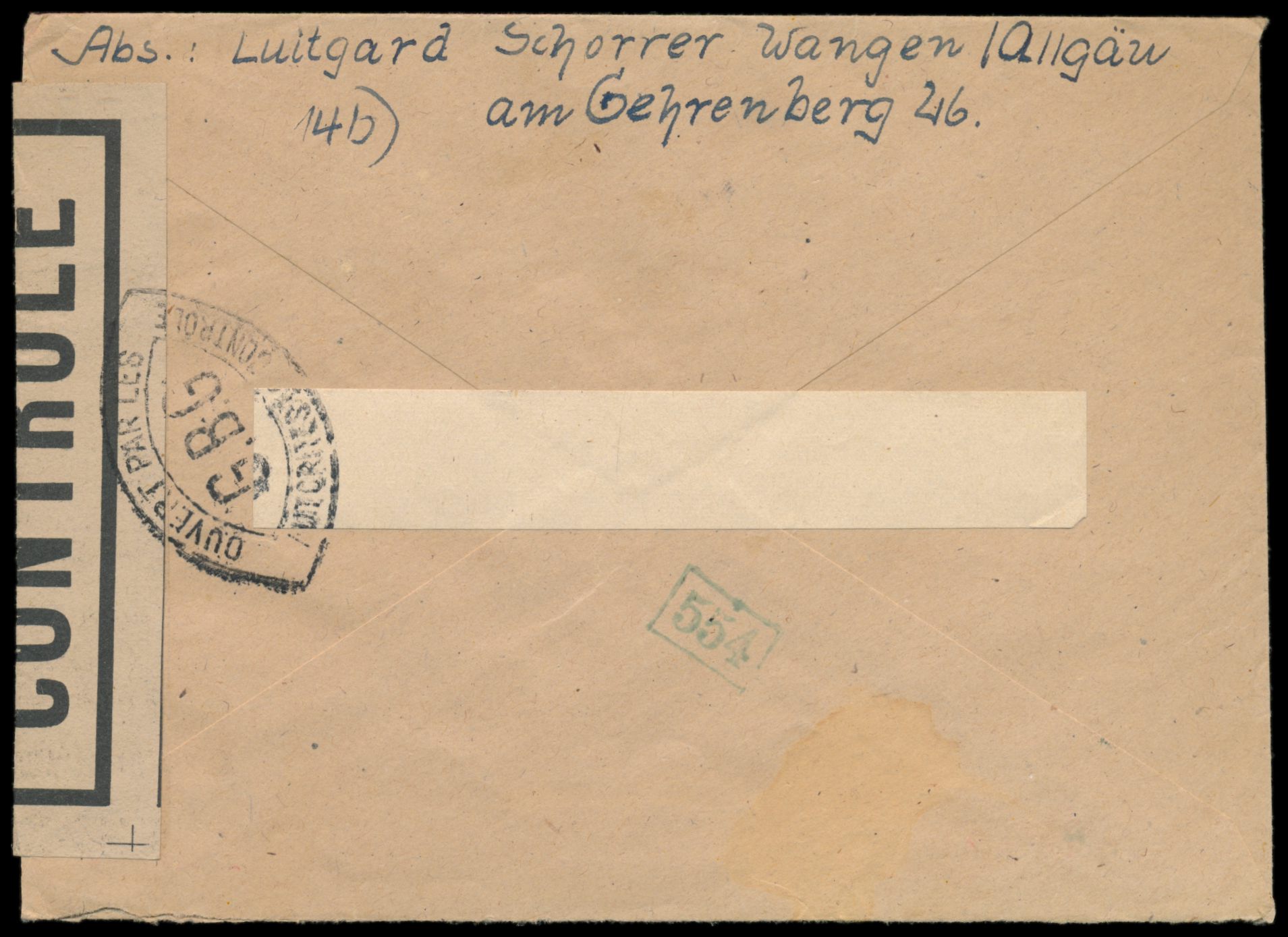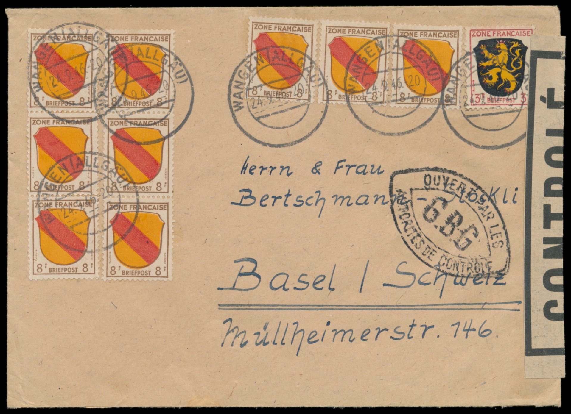 Zensurstelle Tübingen, Auslandsbrief mit Mischfrankatur Allgemeine Ausgabe 75 Pf. in die Schweiz, Stempel Wangen (Allgäu) 24.9.46, rechts grauweißer Verschlußzettel Controlé mit Rahmen (Handbuch Typ 22) und beidseitig schwarzer Doppelspitzovalstempel Ouvert ... G.B.G. , rückseitig grüner Prüferstempel 554, Bedarf