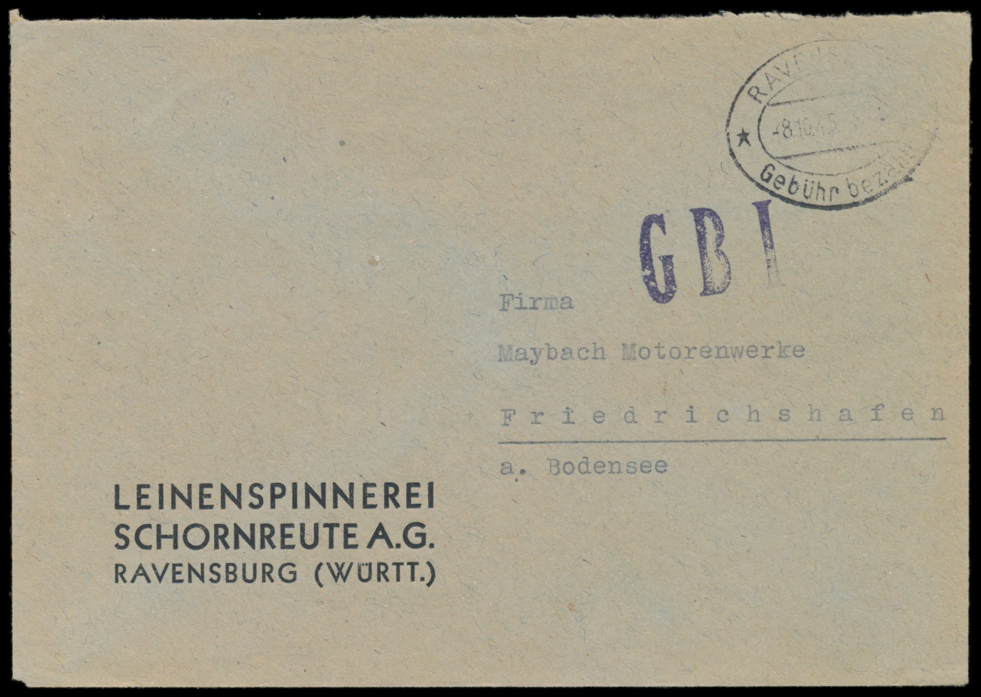 Zensurstelle Lindau, Firmenbrief mit Stempel Ravensburg Gebühr bezahlt 8.10.45 nach Friedrichshafen, violetter L1 G B I, Verwendung nur im Oktober 1945