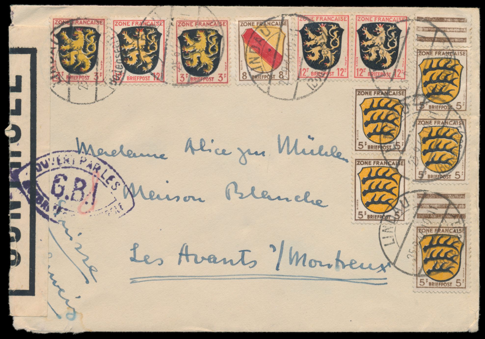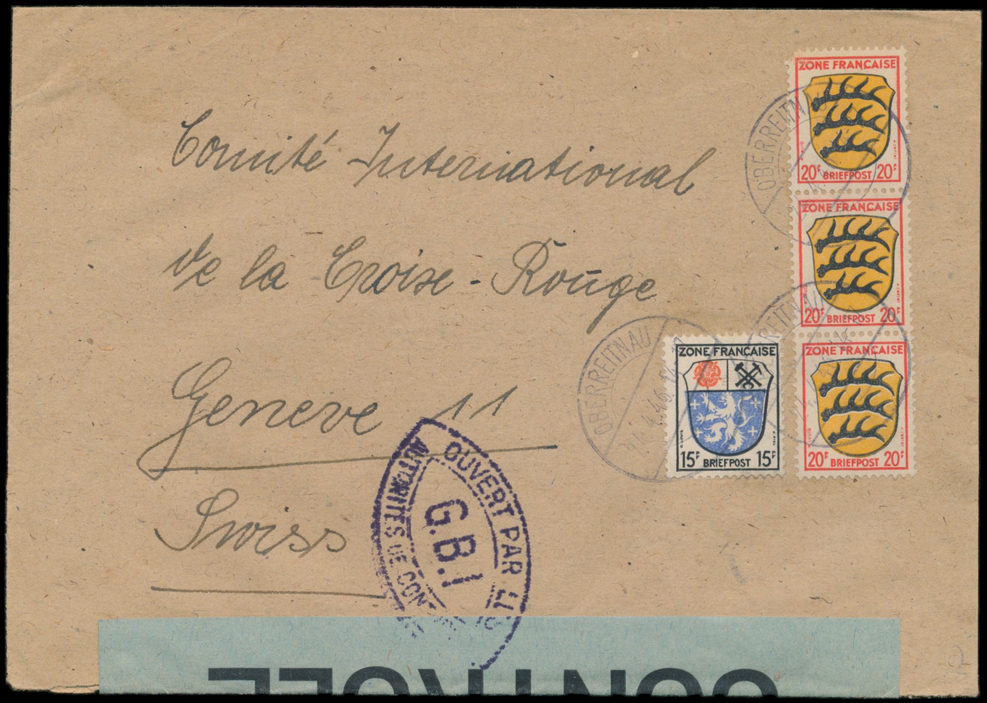 Zensurstelle Lindau, Auslandsbrief mit Allgemeine Ausgabe 15 Pf. und 3 x 20 Pf. in die Schweiz, Stempel Oberreitnau 24.4.46, unten blauer Verschlußzettel Controle ohne Rahmen (Handbuch Typ 1) und beidseitig violetter Doppelspitzovalstempel Ouvert ... G.B.I. (Typ II) ohne handschriftliche Abänderung, Bedarf