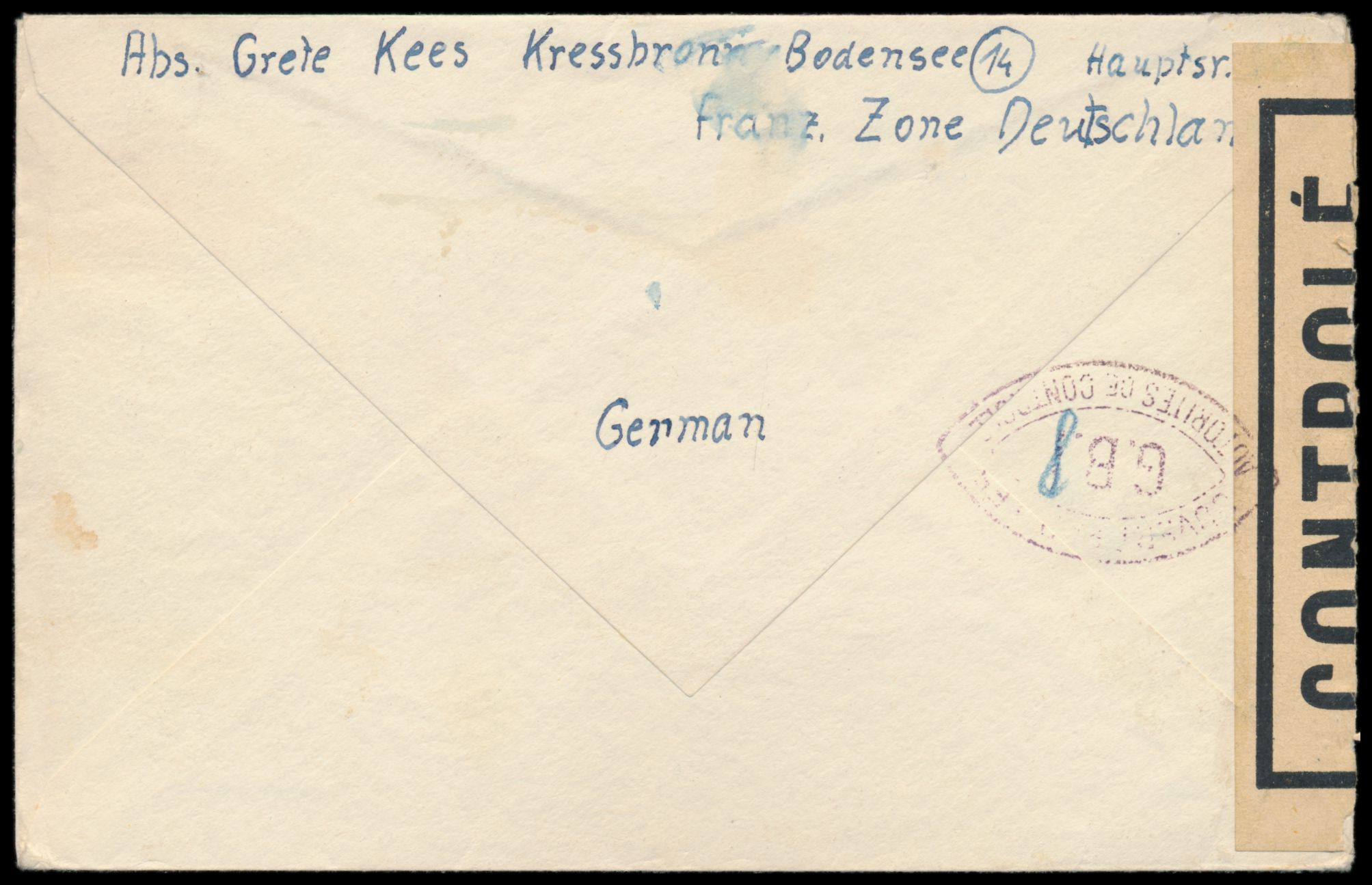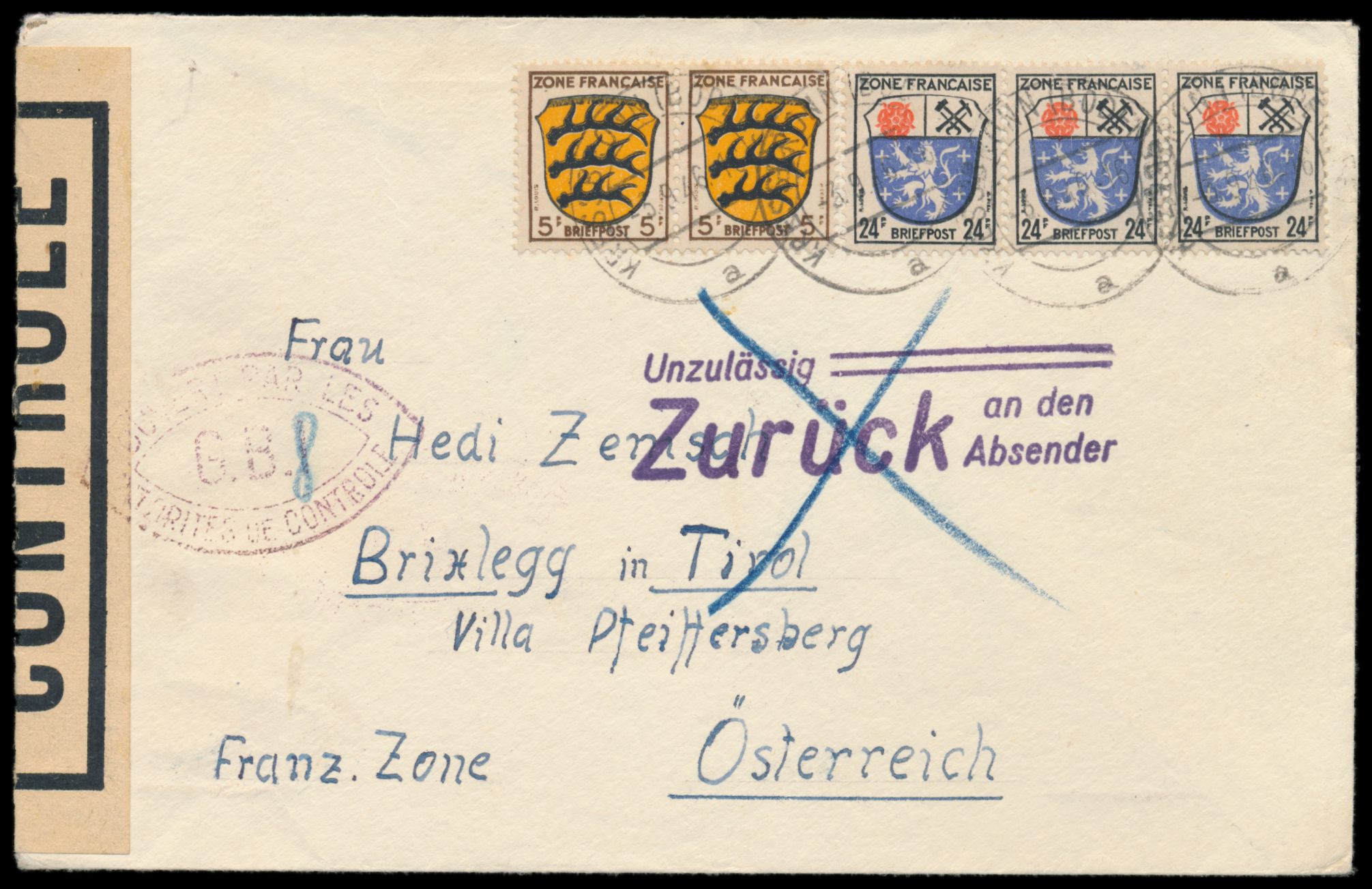 Zensurstelle Lindau, Auslandsbrief mit Allgemeine Ausgabe 2 x 5 Pf. und 3 x 24 Pf. nach Österreich, Stempel Kressbronn (Bodensee) 3.9.46, links beiger Verschlußzettel Controlé mit Rahmen (Handbuch Typ 22) und beidseitig violetter Doppelspitzovalstempel Ouvert ... G.B.I. (Typ II) mit handschriftlicher Abänderung des "I" in "8", violetter Beanstandungsstempel Unzulässig / Zurück / an den / Absender wieder durchgestrichen , Bedarf