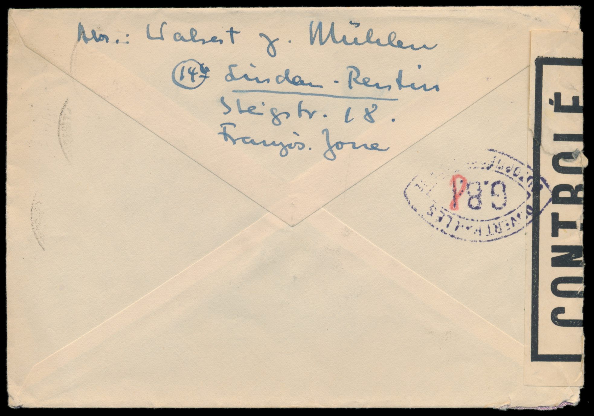 Zensurstelle Lindau, Auslandsbrief mit Mischfrankatur Allgemeine Ausgabe 75 Pf. nach Frankreich, Stempel Lindau (Bodensee) 1 25.9.46, links weißer Verschlußzettel Controlé mit Rahmen (Handbuch Typ 22) und beidseitig violetter Doppelspitzovalstempel Ouvert ... G.B.I. (Typ II) mit handschriftlicher Abänderung des "I" in "8", Bedarf