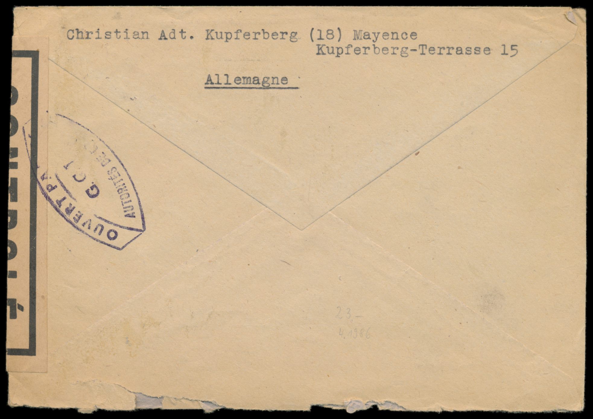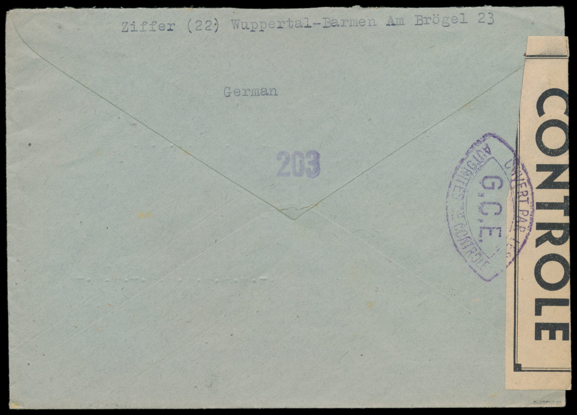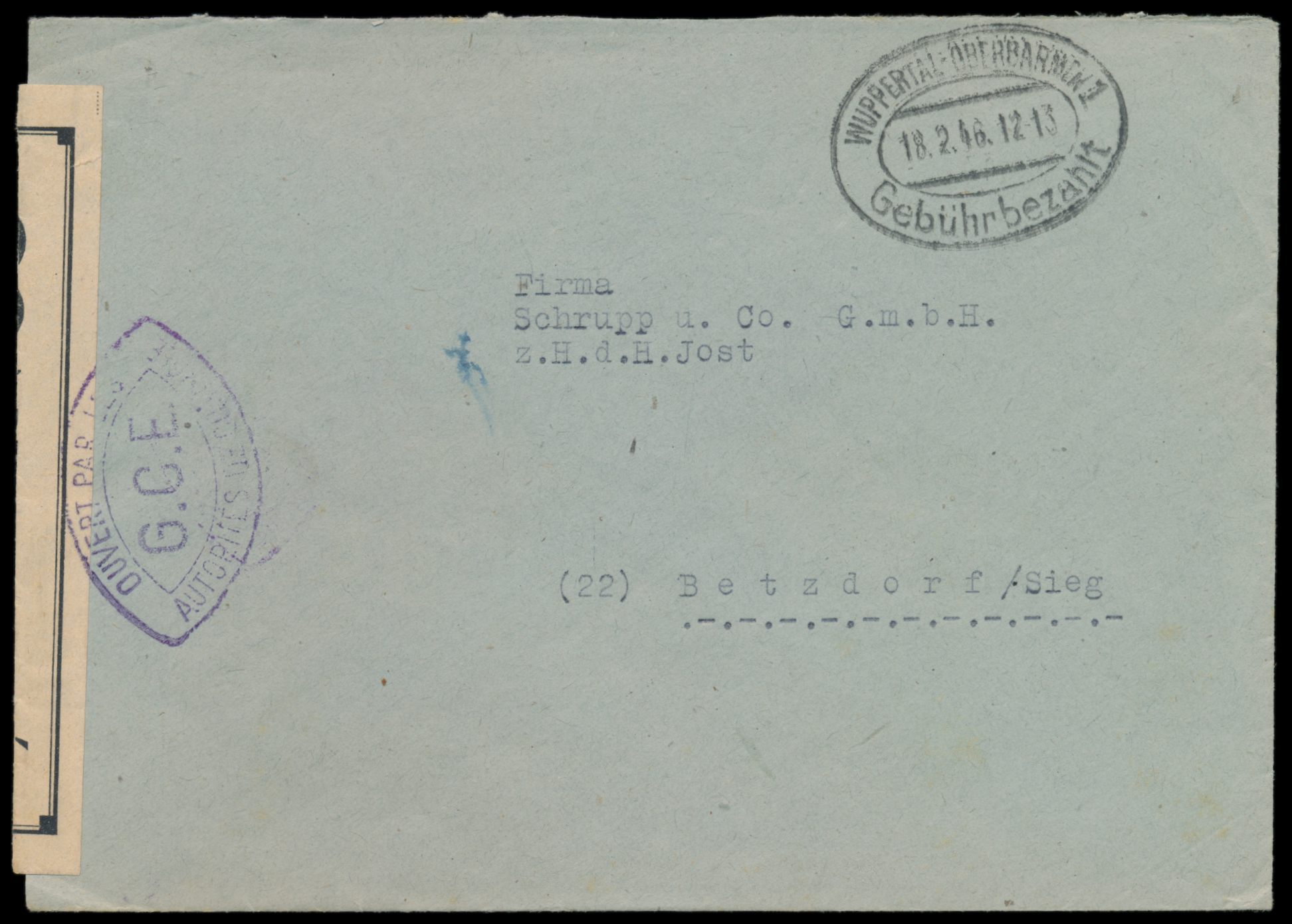 Zensurstelle Koblenz, Brief mit Stempel Wuppertal-Oberbarmen 1 Gebühr bezahlt 18.2.46 nach (22) Betzdorf / Sieg, links weißer Verschlußzettel Controlé mit Doppelrahmen (Handbuch Typ 44), beidseitig violetter Doppelspitzovalstempel Ouvert ... G.C.E., rückseitig Prüfer-Nummernstempel 203, nur wenige Belege aus der Zeit vor Aufnahme des Auslandspostverkehrs am 1.4.1946 bekannt, Abbildungsstück im Handbuch F.Z.