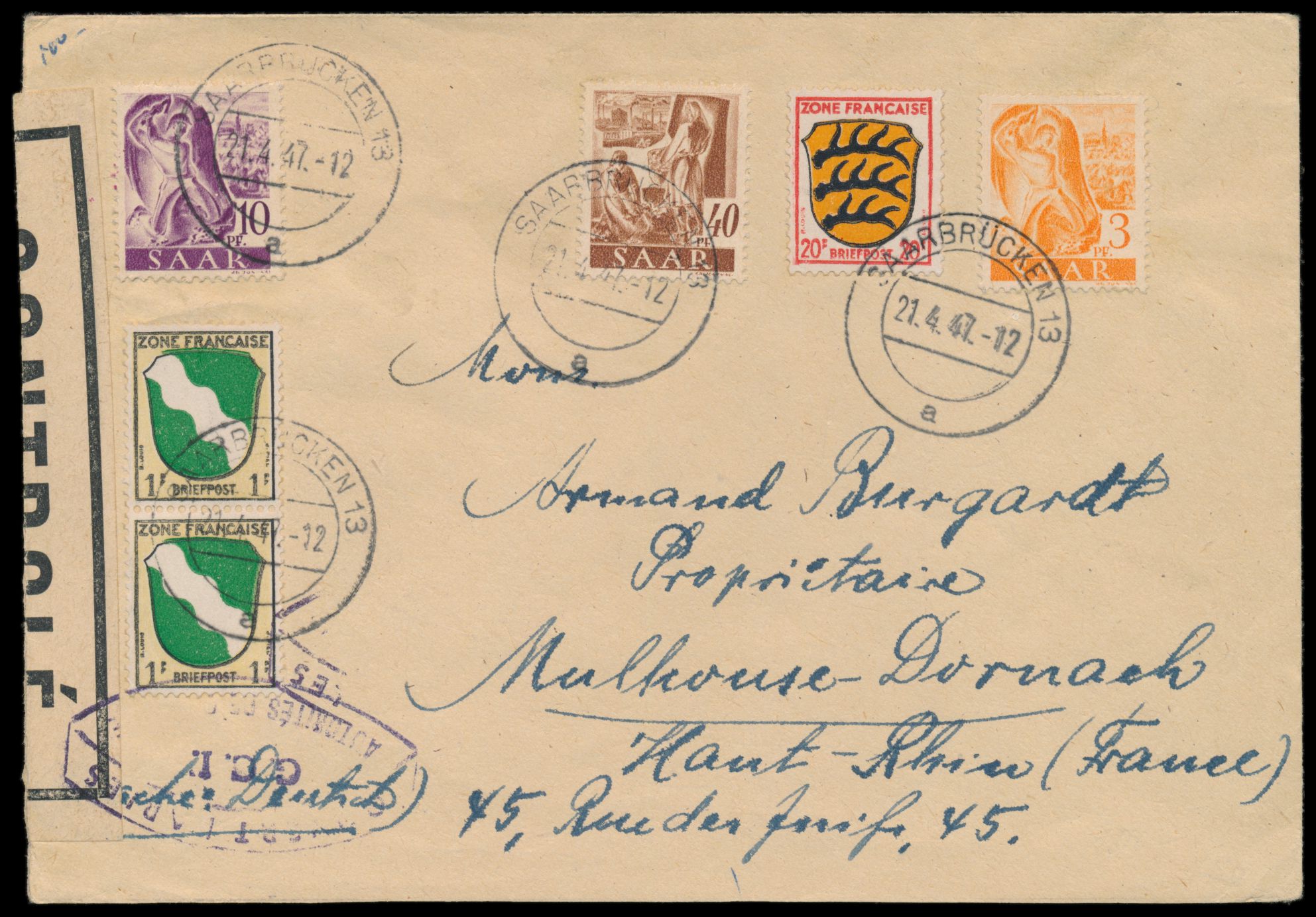 Zensurstelle Saarbrücken, Mischfrankatur Allgemeine Ausgabe 2 x 1 Pf. und 20 Pf. mit Saar 3, 10 und 40 Pf. auf Auslandsbrief nach Frankreich, portorichtig, Stempel Saarbrücken 13 21.4.47, violetter Doppelellipsen-Stegstempel Ouvert ... G.C.I. beidseitig auf weißem Verschlußzettel Controlé, Handbuch Typ 24