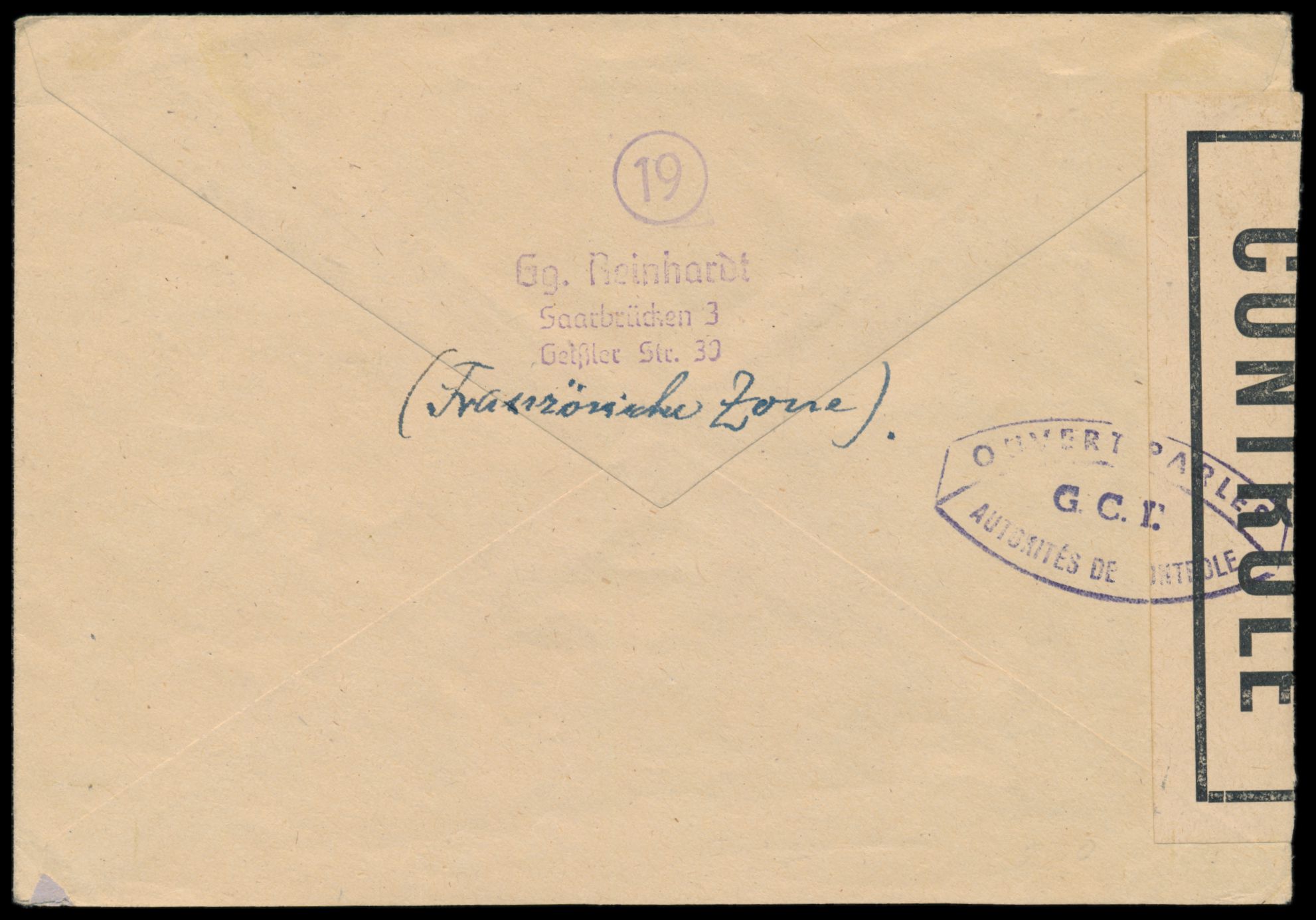 Zensurstelle Saarbrücken, Auslandsbrief nach Paris, Stempel Mainz 20.9.46 und roter R3 Taxe percue, handschriftlich 75 Pf., rechts beiger Verschlußzettel Controlé (Handbuch Typ 22), beidseitig violetter Ellipsenstempel Ouvert ... G.C.I. (Type I)