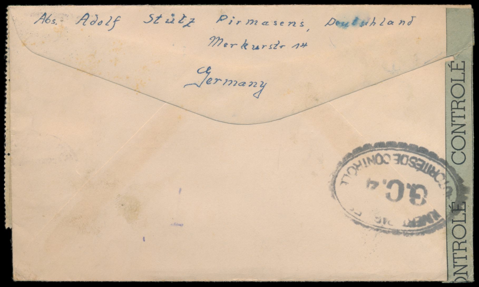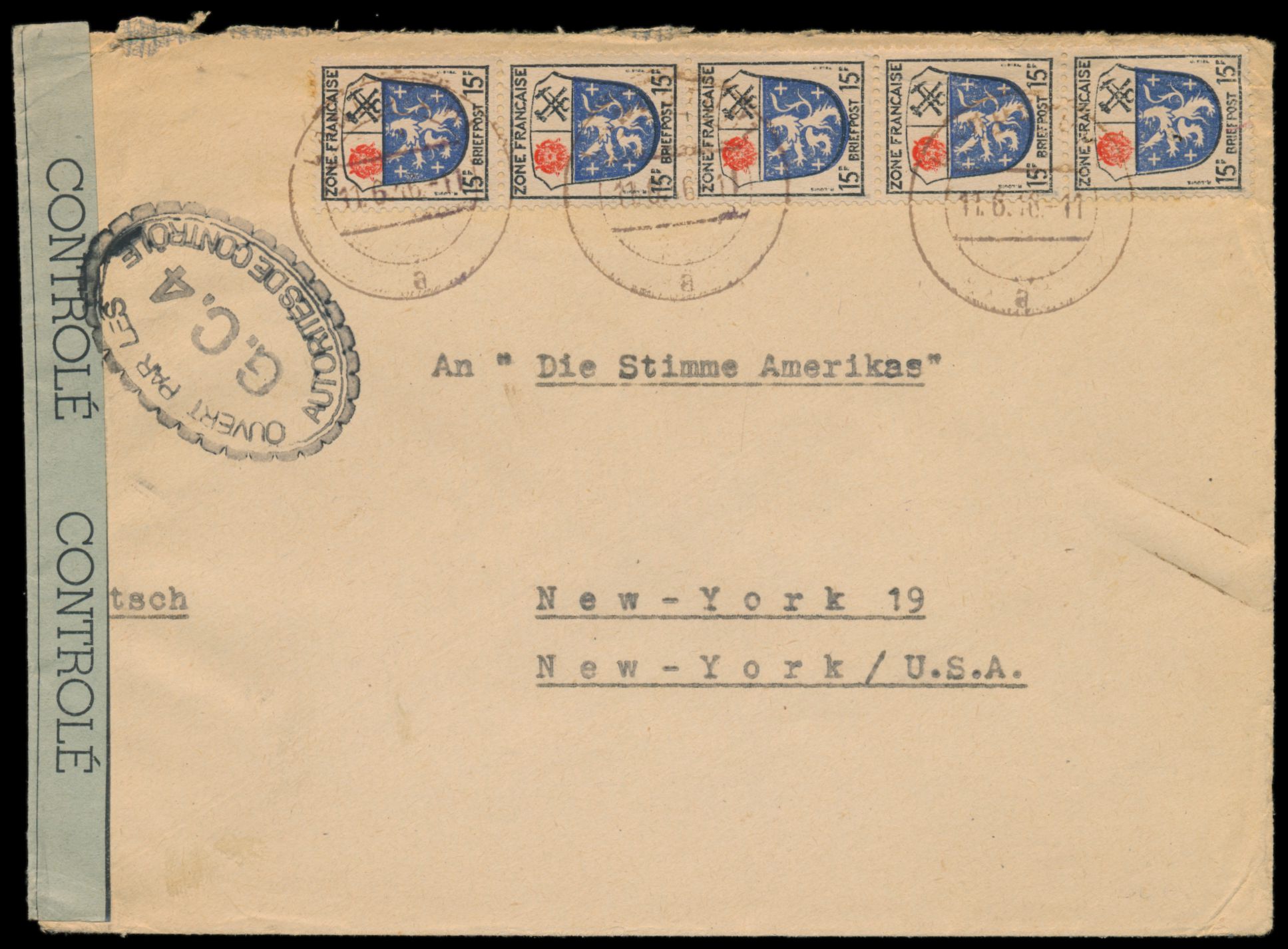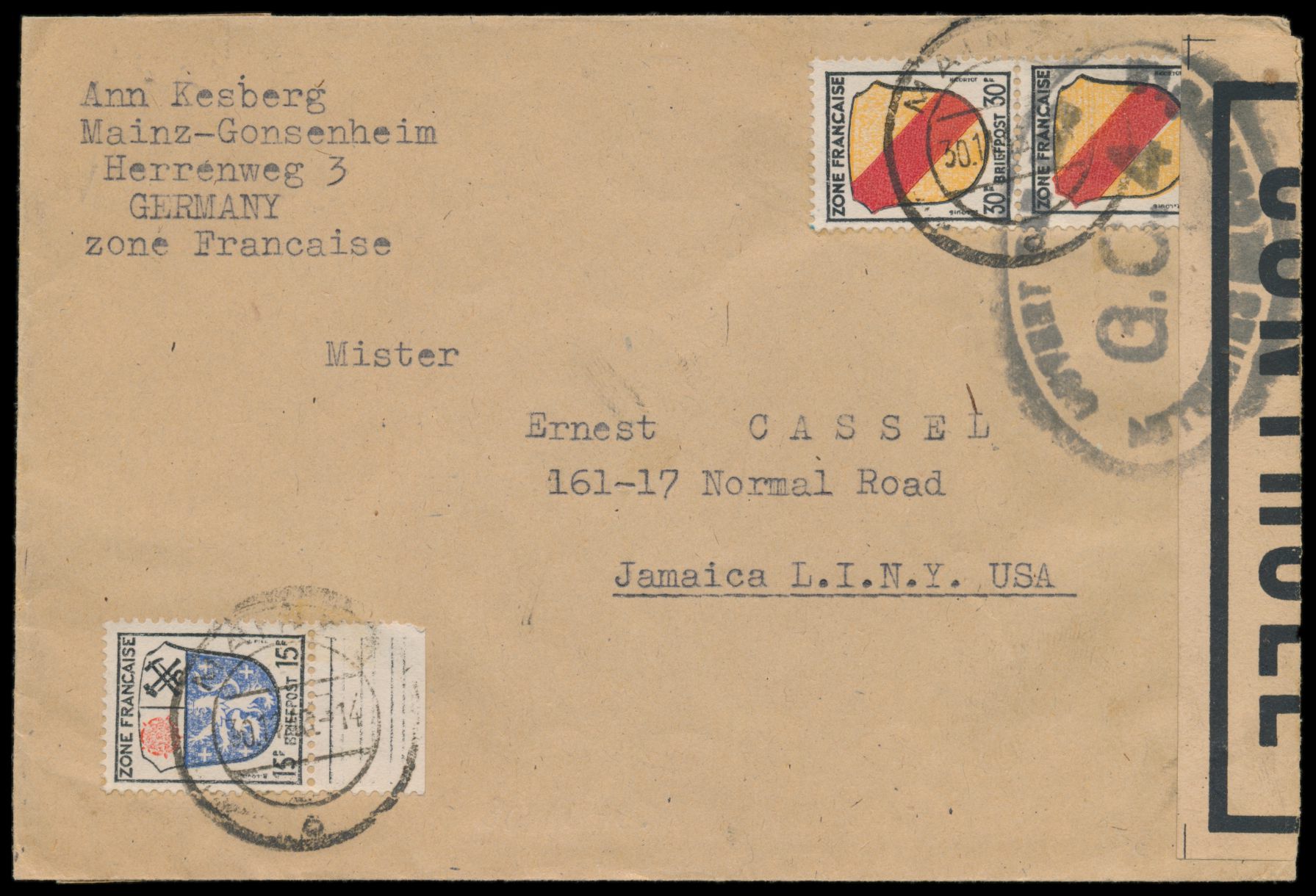 Zensurstelle Worms, Auslandsbrief nach USA, Frankatur Allgemeine Ausgabe 15 Pf. und 2 x 15 Pf., Stempel Mainz 30.11.46, rechts beiger Verschlußzettel Controlé (Handbuch Typ 22), beidseitig schwarzer Ovalstempel Ouvert ... G.C.4 mit Zierkranz (bereits stark "gewachsen")