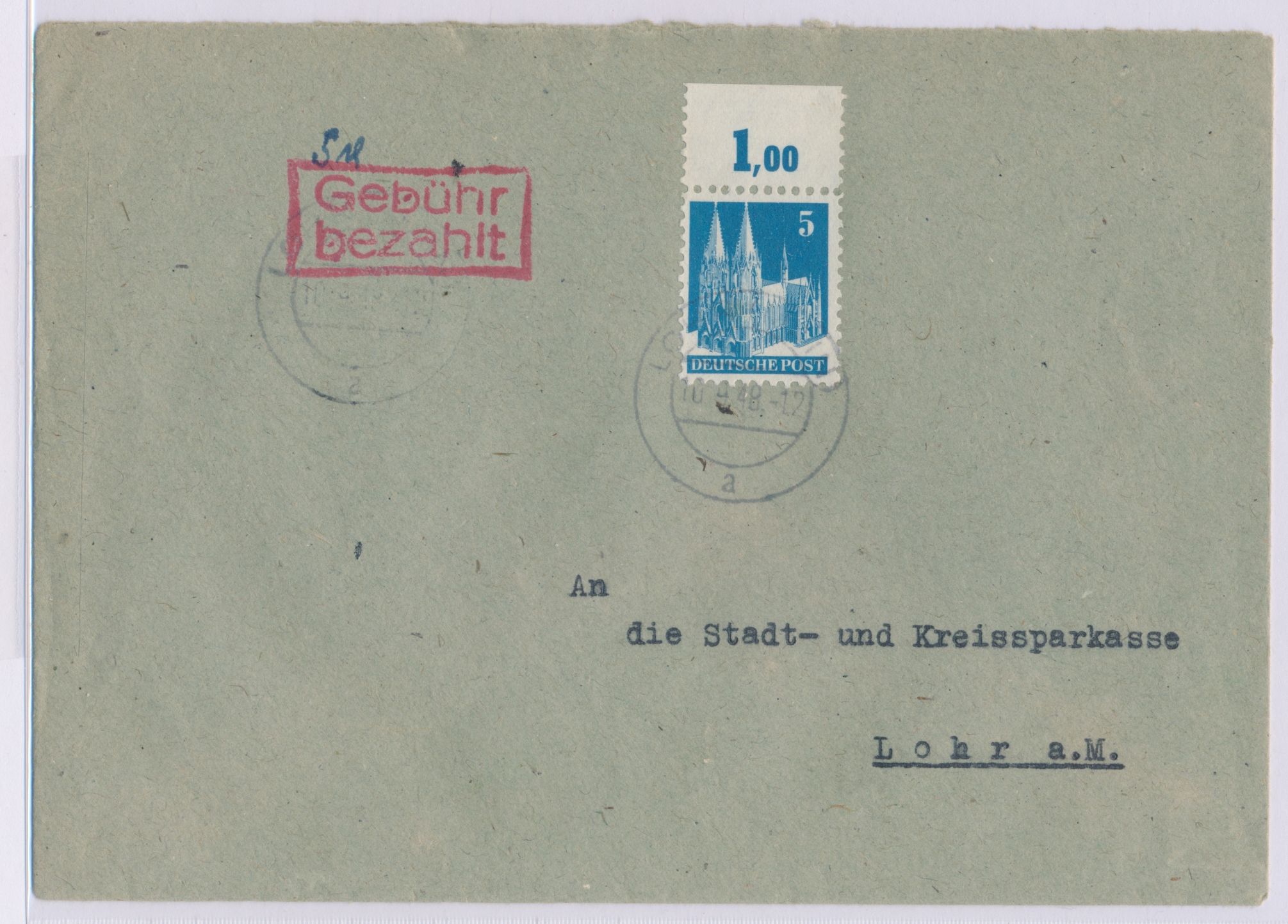 5 Pf. mit Oberrand und roter R2 Gebühr bezahlt als Teilbarfrankatur auf Ortsbrief mit Stempel Lohr (Main) 10.9.48