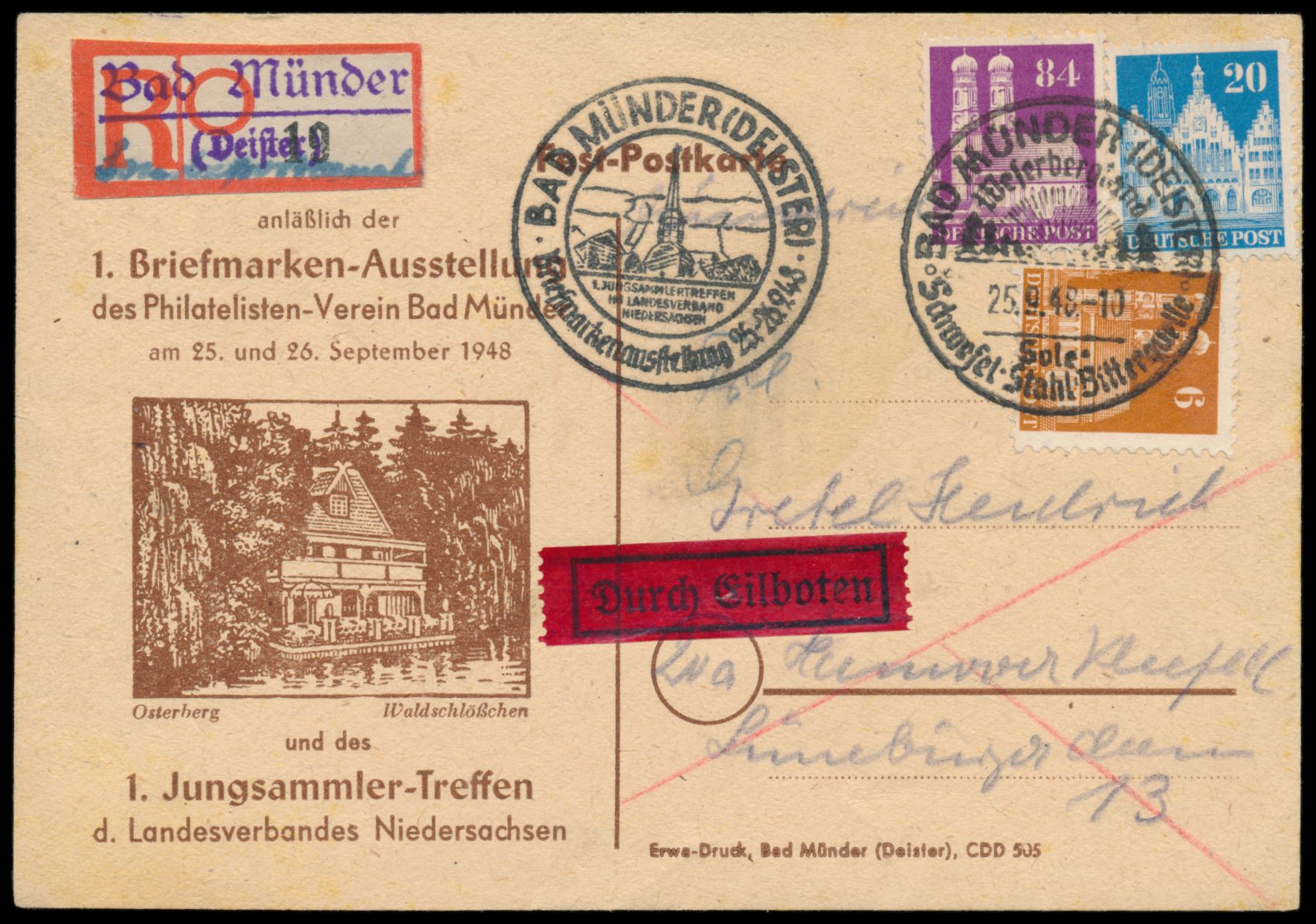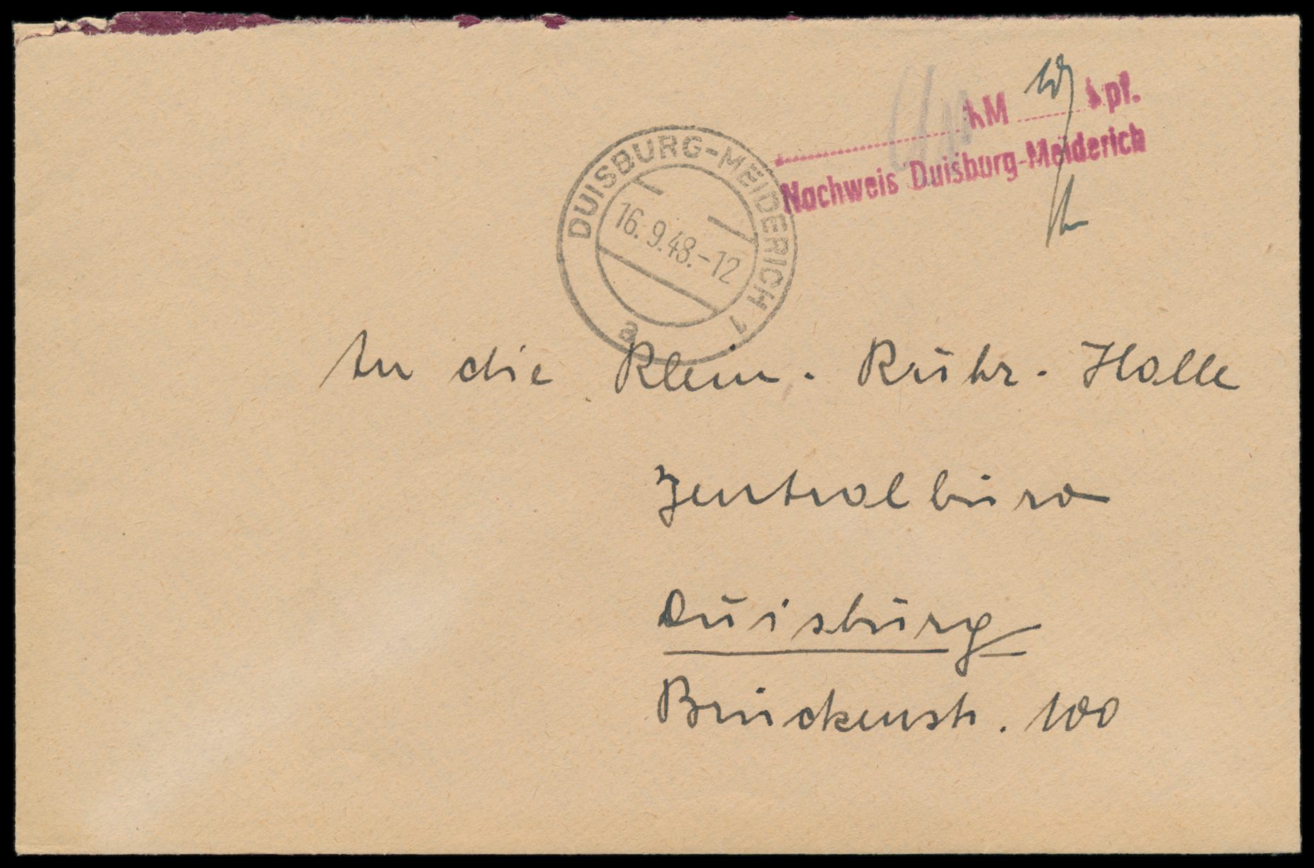 Ortsbrief mit Stempel Duisburg-Meiderich 1 16.9.48 und seltenem roten L2 ... (R)M ... (R)pf. Nachweis Duisburg-Meiderich (Währungsbezeichnung teilweise aptiert), Bedarf