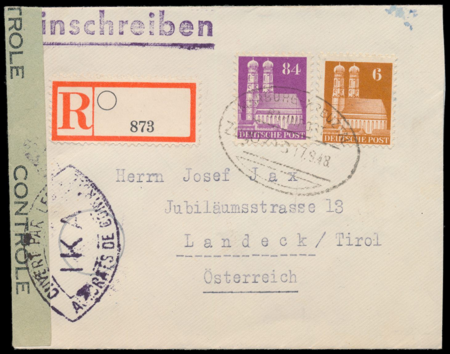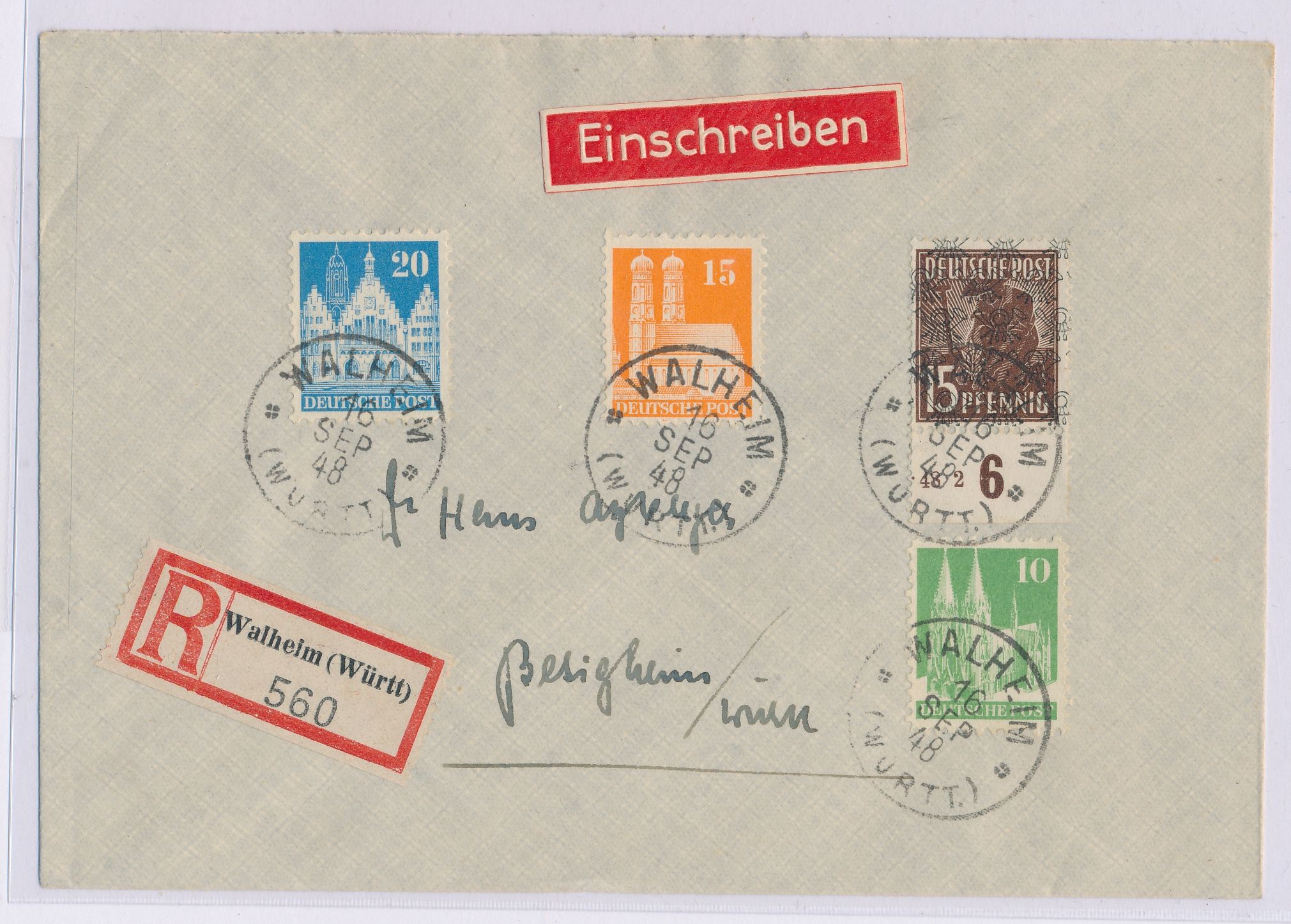 Mischfrankatur Bizone / Bauten 60 Pf. auf Einschreibbrief mit Württemberg-K1 Walheim (Württ.) 16.9.48 nach Besigheim, portorichtig