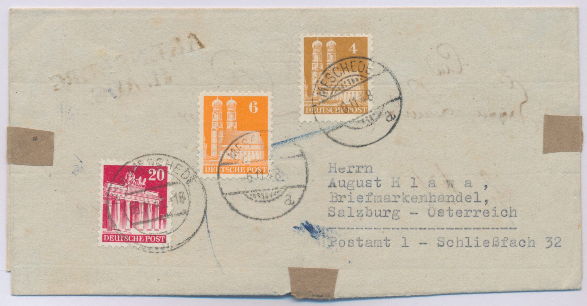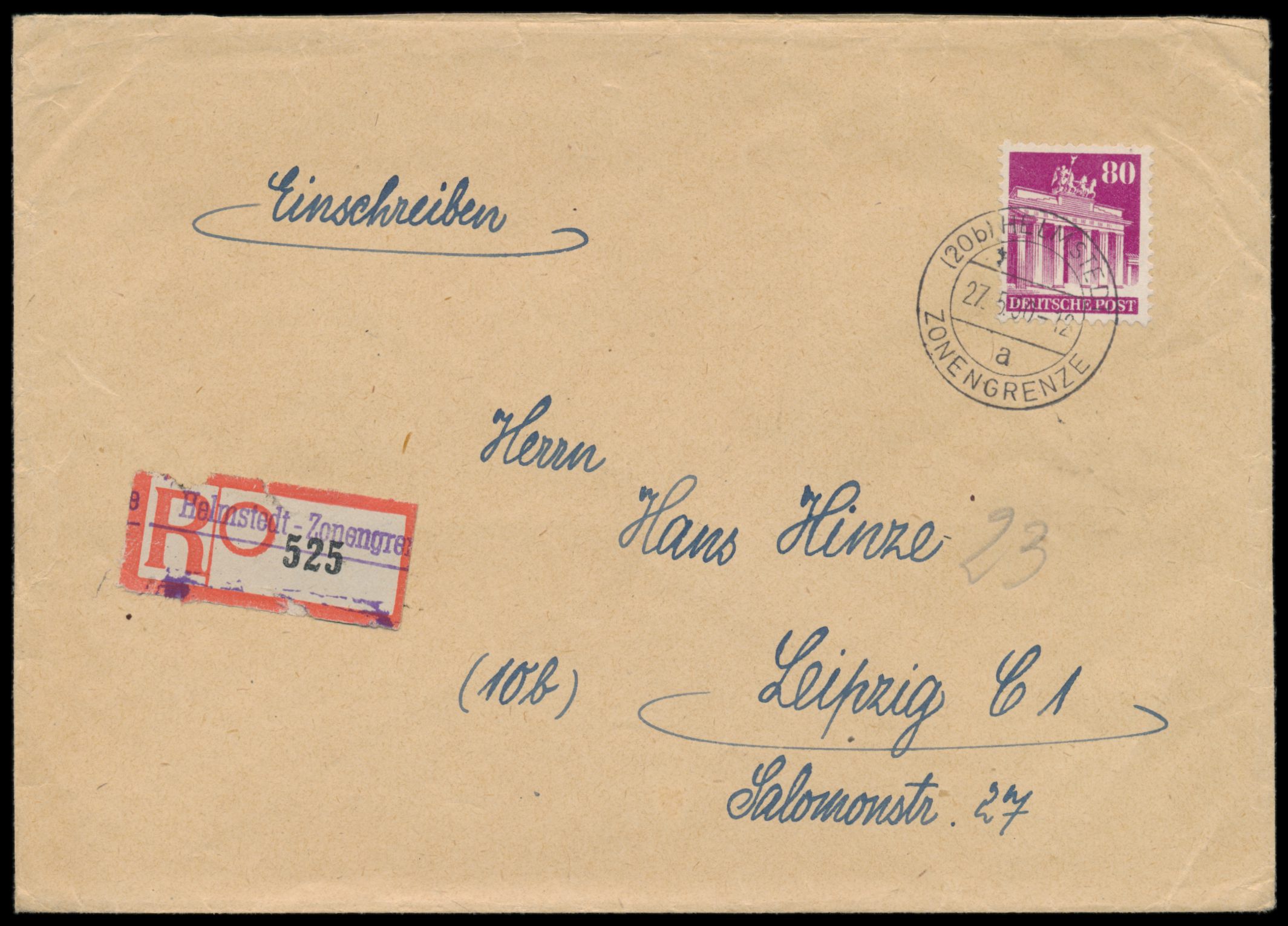 Einzelfrankatur 80 Pf. auf Einschreibbrief 2. Gewicht mit Stempel Helmstedt Zonengrenze 27.5.50 nach Leipzig, Blanko-R-Zettel mit violettem L1 Helmstedt-Zonengrenze, Ankunftstempel Leipzig 28.8.50, Bedarf, mit Bautenserie selten