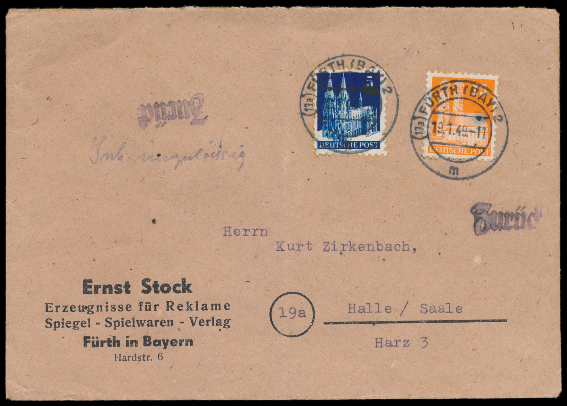Brief mit Stempel Fürth (Bay) 2 19.1.49 nach Halle (Saale) / SBZ, violetter L1 Zurück, handschriftlich "Inh. unzulässig" (stumme sowjetische Zensur), schwacher senkrechter Mittelbug, Bedarf