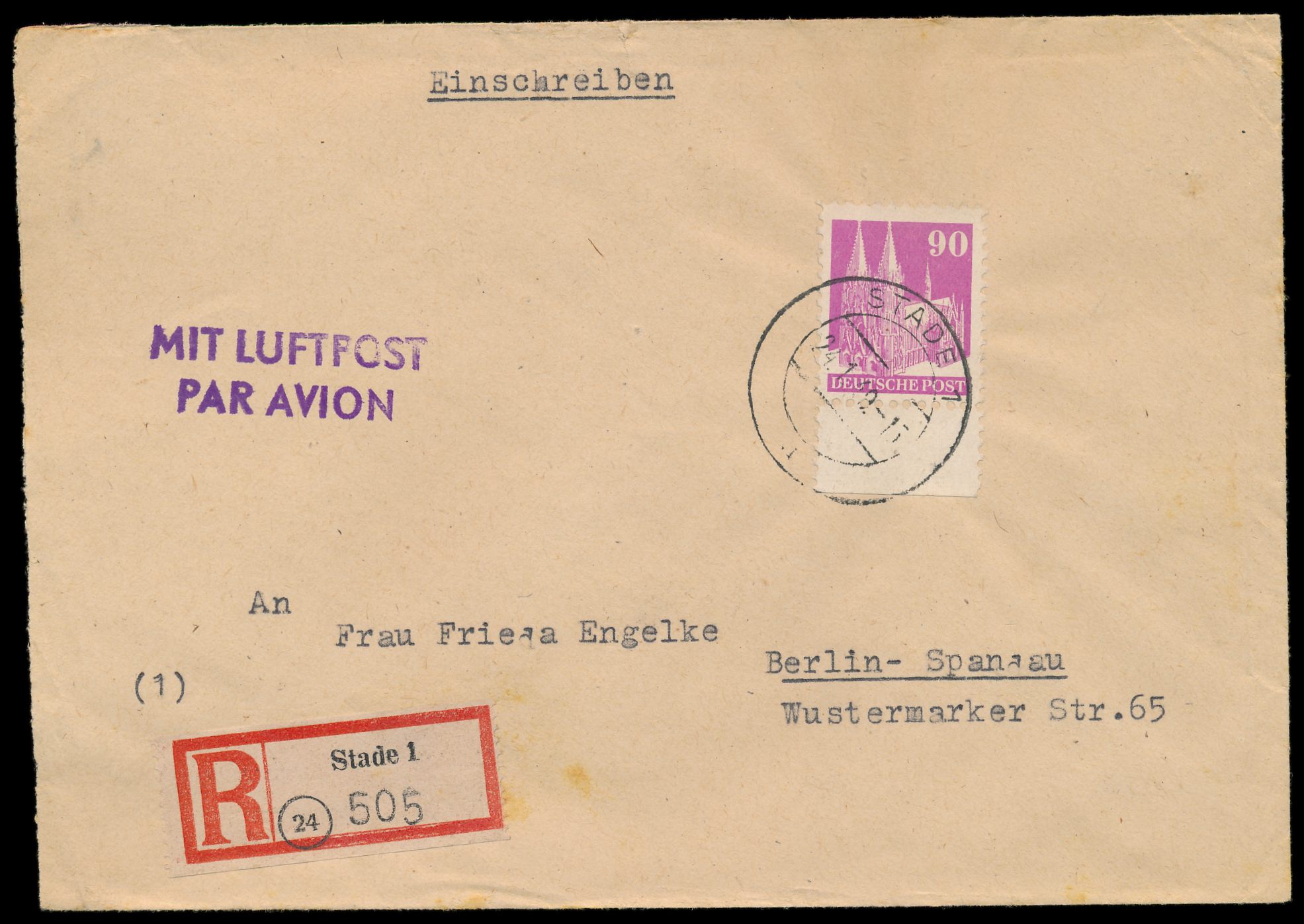 Einzelfrankatur 90 Pf. auf Luftpost-Einschreibbrief 2. Gewicht nach Berlin-Spandau, Stempel Stade 1 24.1.49, Ankunftstempel 29.1.49, portorichtig, Bedarf