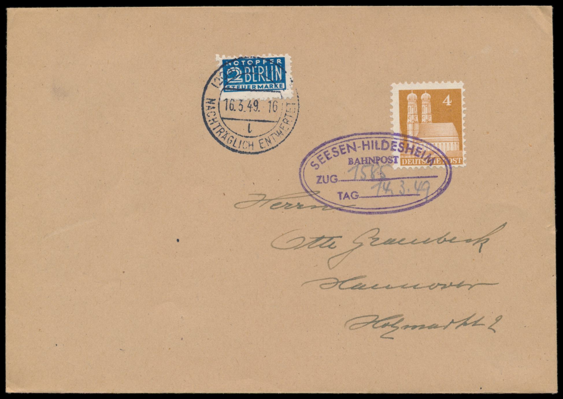Bahnpost-Notstempel Seesen - Hildesheim Zug ... Tag ... auf Drucksache mit 4 Pf. Bauten und 2 Pf. Notopfer, Notopfermarke mit Stempel Hannover Nachträglich entwertet 16.3.49