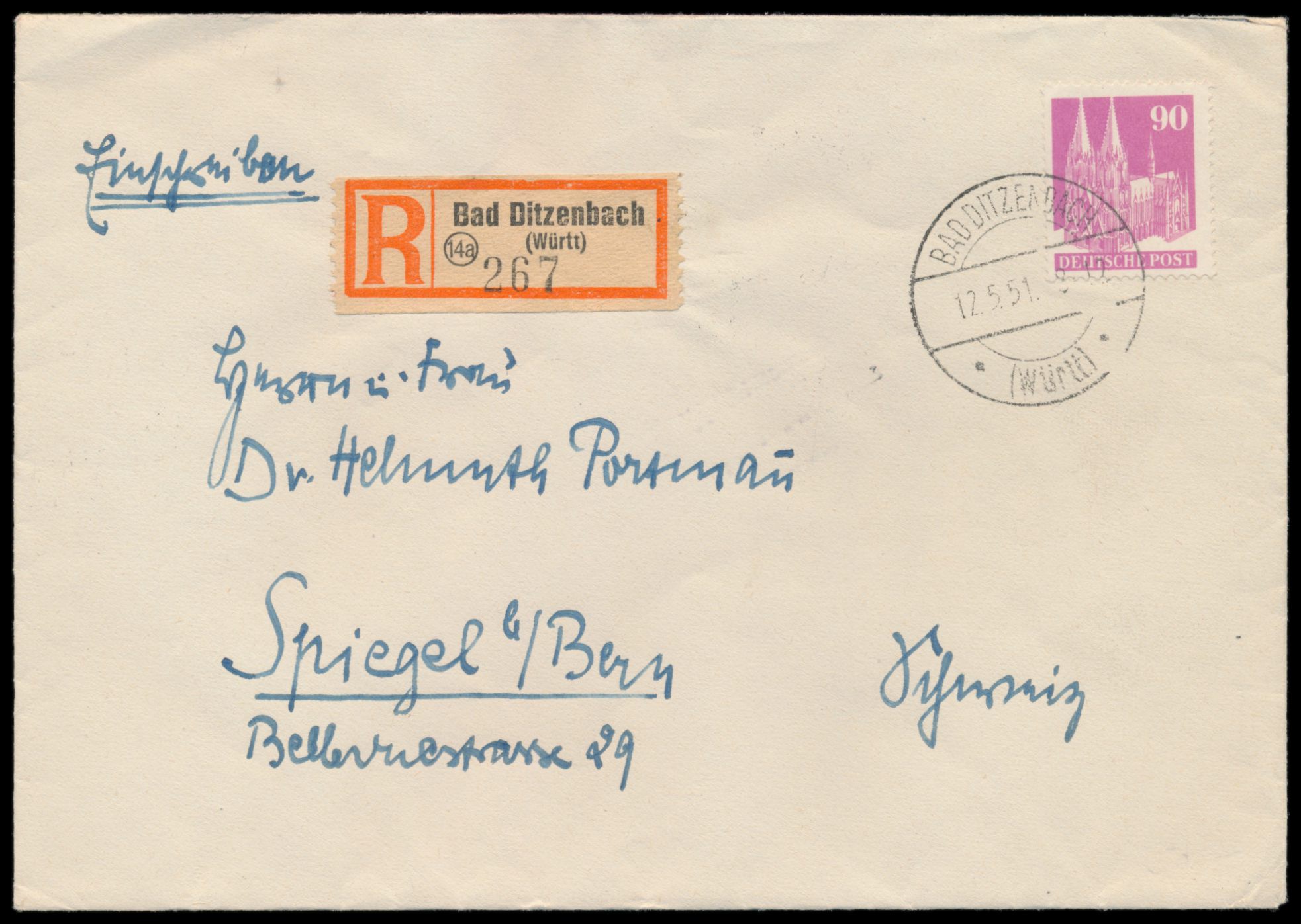 Einzelfrankatur 90 Pf. eng gezähnt auf Auslands-R-Brief 2. Gewicht mit Stempel Bad Ditzenbach (Württ) 12.5.51 in die Schweiz, Ankunftstempel Spiegel 14.5.51, portorichtig, Bedarf