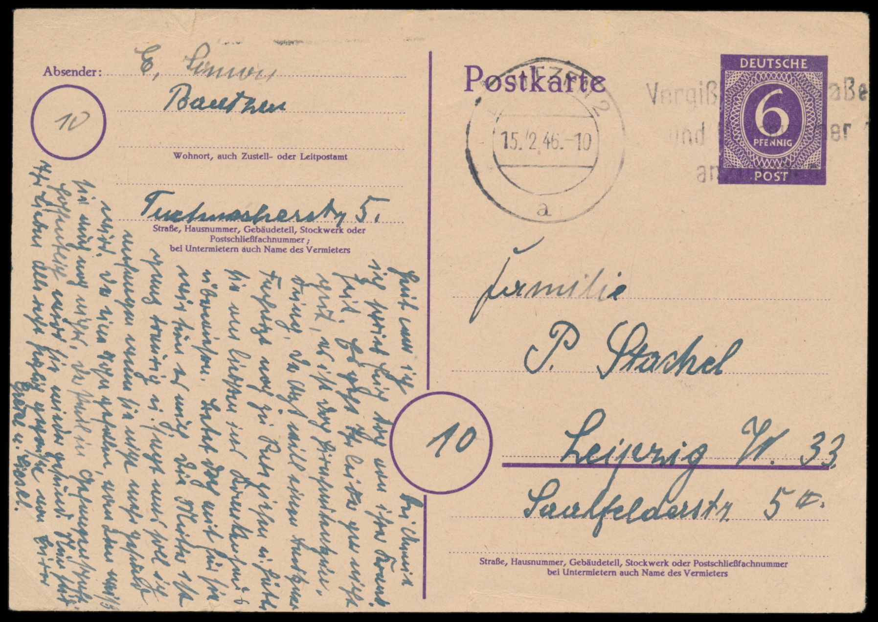 Ganzsache 6 Pf. Ziffer mit Maschinenstempel Bautzen 2 15.2.46 nach Leipzig, seltene Frühverwendung in der OPD Dresden, Bedarf