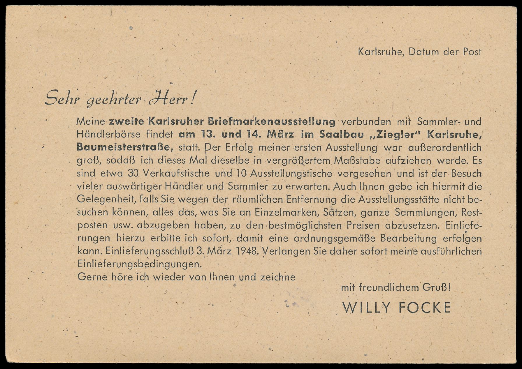 Ganzsache 10 Pf. Ziffer mit beidseitigem Zudruck "Willy Focke, Karlsruhe i. B." als Drucksache nach Zirndorf, Maschinen-Werbestempel Karlsruhe (Baden) 2 23.1.48