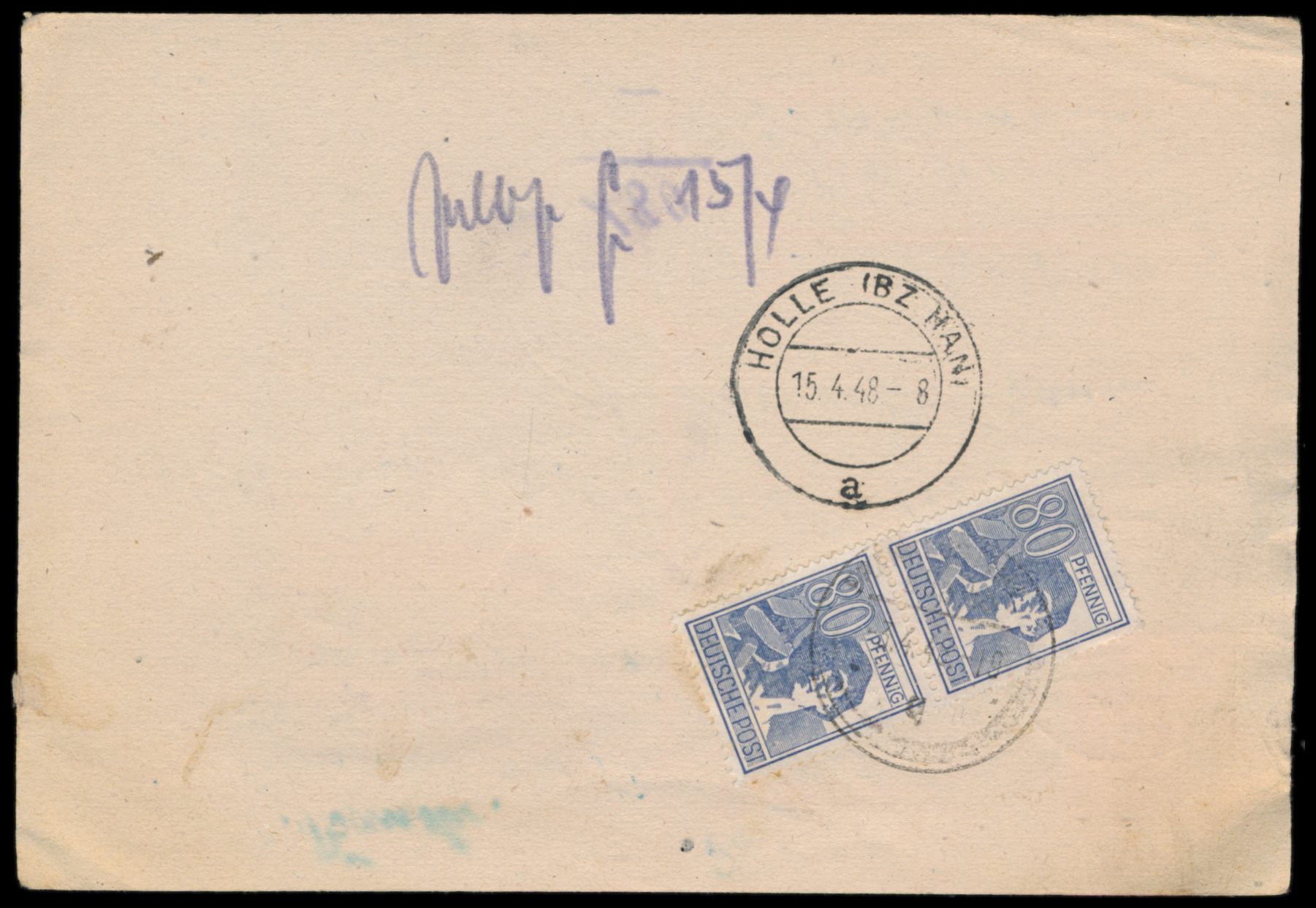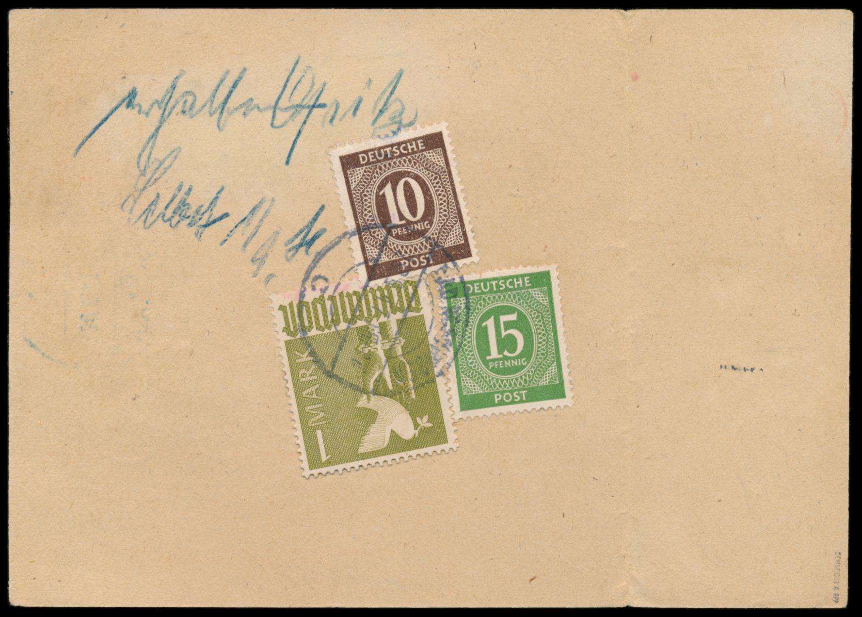Ganzsache 10 Pf. Ziffer mit Zusatzfrankatur 10 Pf. und 2 x 80 Pf. Arbeiter (letztere rückseitig) als Notpaketkarte mit Stempel Frankfurt (Main) Süd 10 3.4.48, für ein Paket nach (20) Dernburg, Wertangabe 100 RM, Gewicht 6 Kg, Porto 180 Pf., Ankunftstempel Holle 15.4.48, komplette Karte, übliche leichte Beförderungsspuren