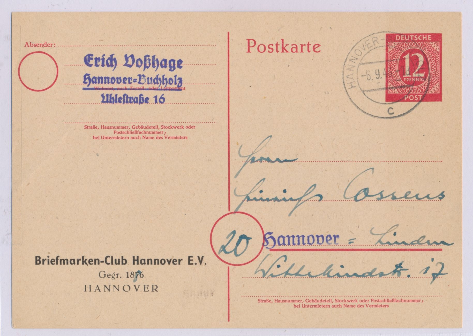 Ganzsache 12 Pf. Ziffer rot mit beidseitigem Zudruck "Briefmarken-Club Hannover E.V.", Druckfehler (Gründungsjahr) im Absender handschriftlich korrigiert, Einladung vom 5.9.1946 zu einer außerordentlichen Hauptversammlung, Stempel Hannover-Buchholz 6.9.46, Ortskarte