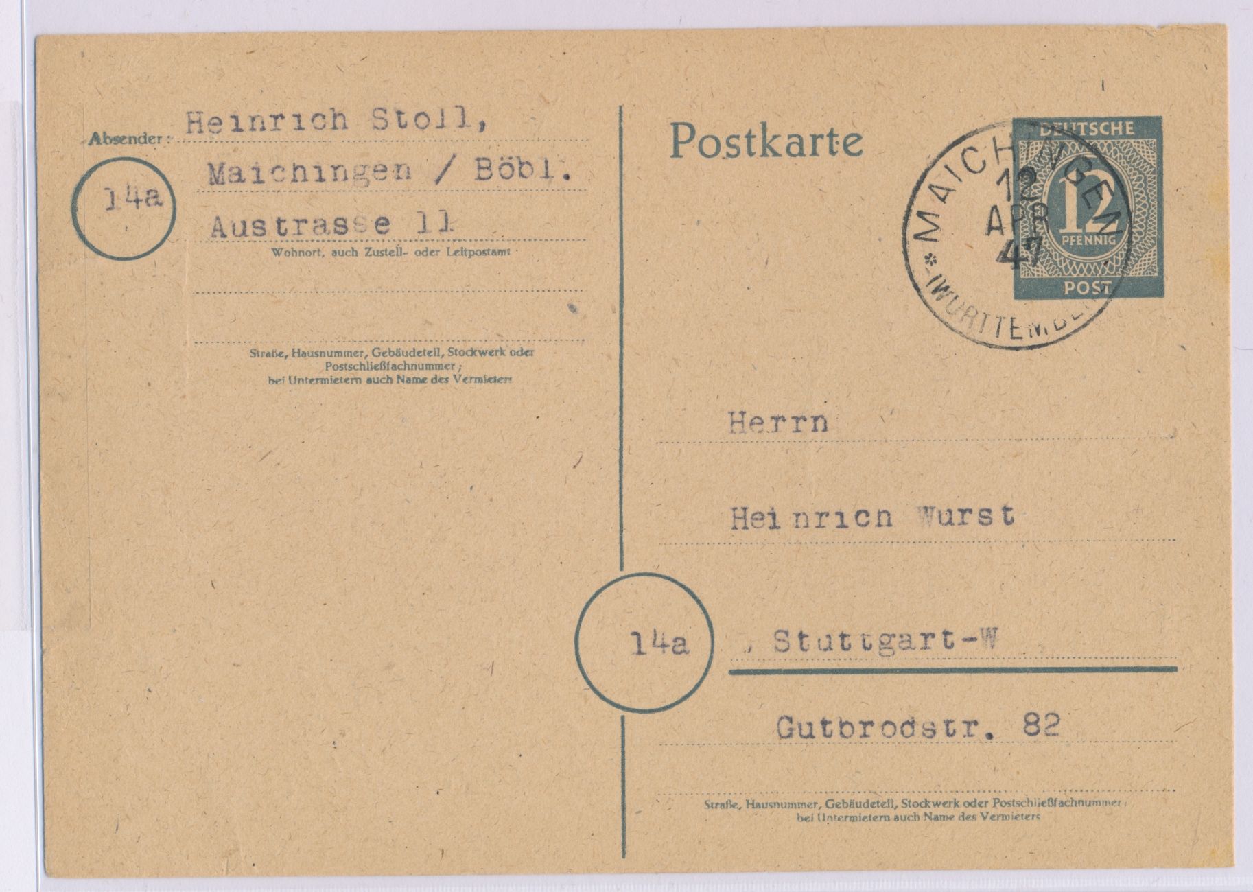 Württemberg-K1 Maichingen (Württemberg) 12. Apr. 47 auf Ganzsache 12 Pf. nach Stuttgart, Bedarf