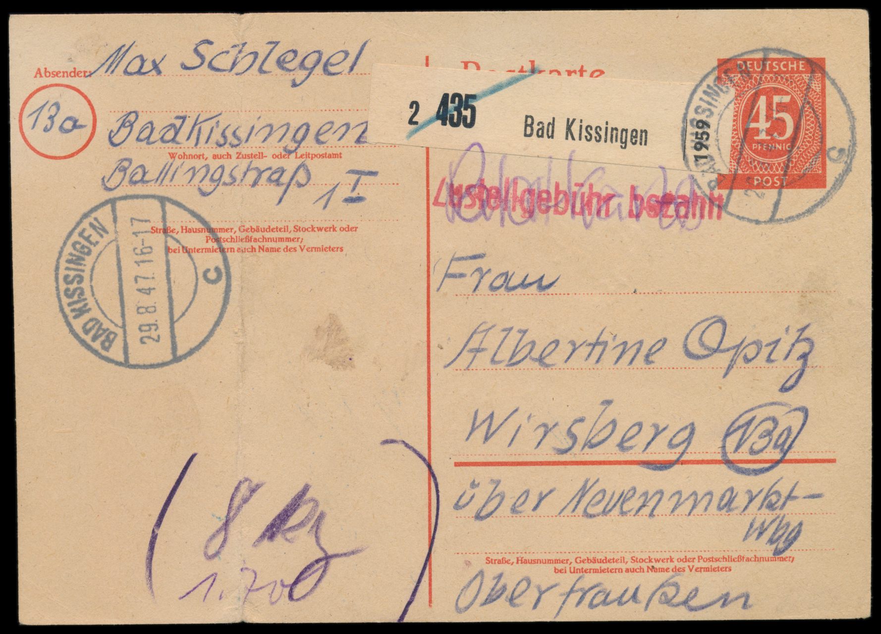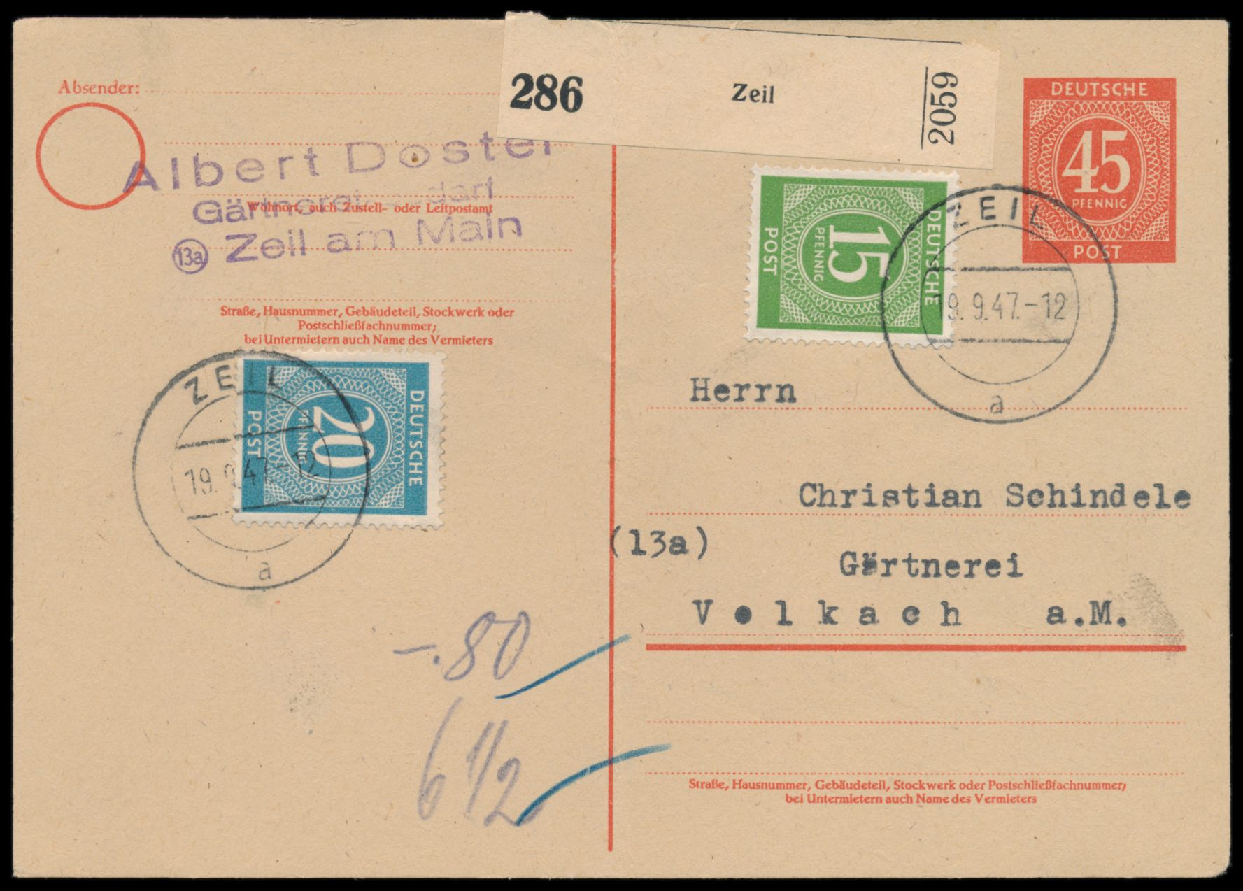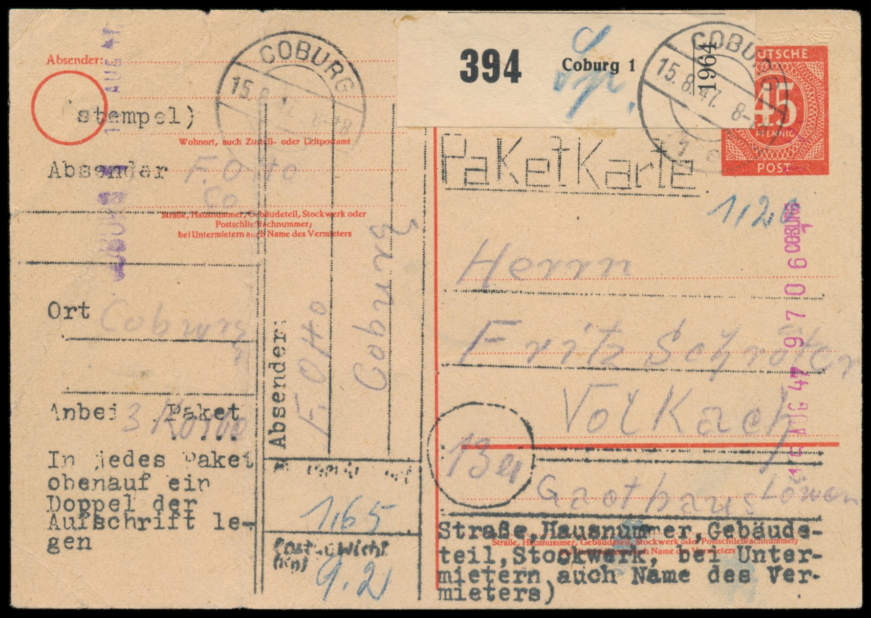Ganzsache 45 Pf. Ziffer mit Matrizüberdruck als Notpaketkarte, Stempel Coburg 1 15.8.47, roter Registrierkassenstempel Coburg 1, handschriftlich 1,20 M. und "Sp." (Sperrgut) für ein Paket 9,2 Kg nach Volkach, Porto 1,65 M., somit Teilbarfrankatur, komplett mit Empfängerabschnitt, Ankunftstempel 19.8.47, übliche leichte Beförderungsspuren