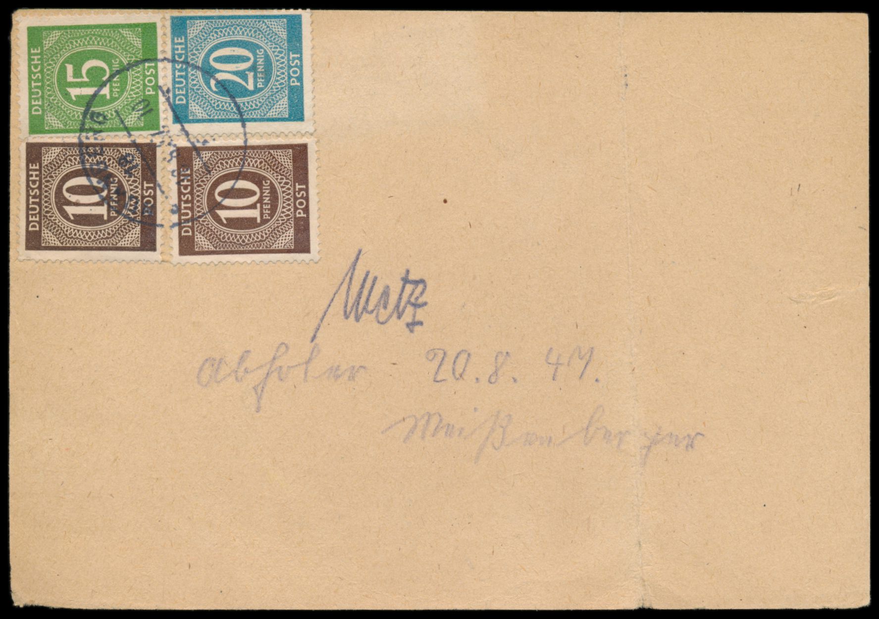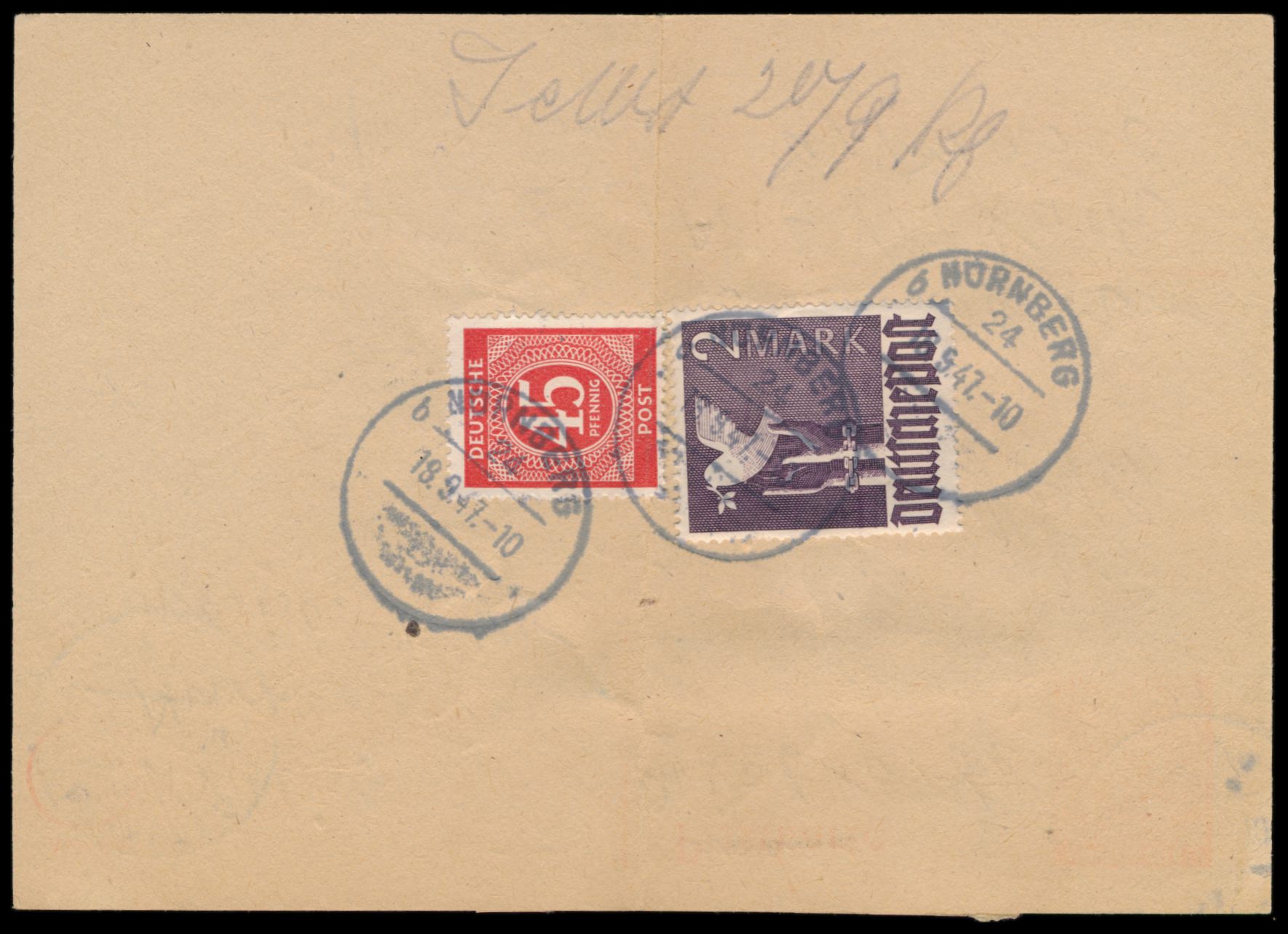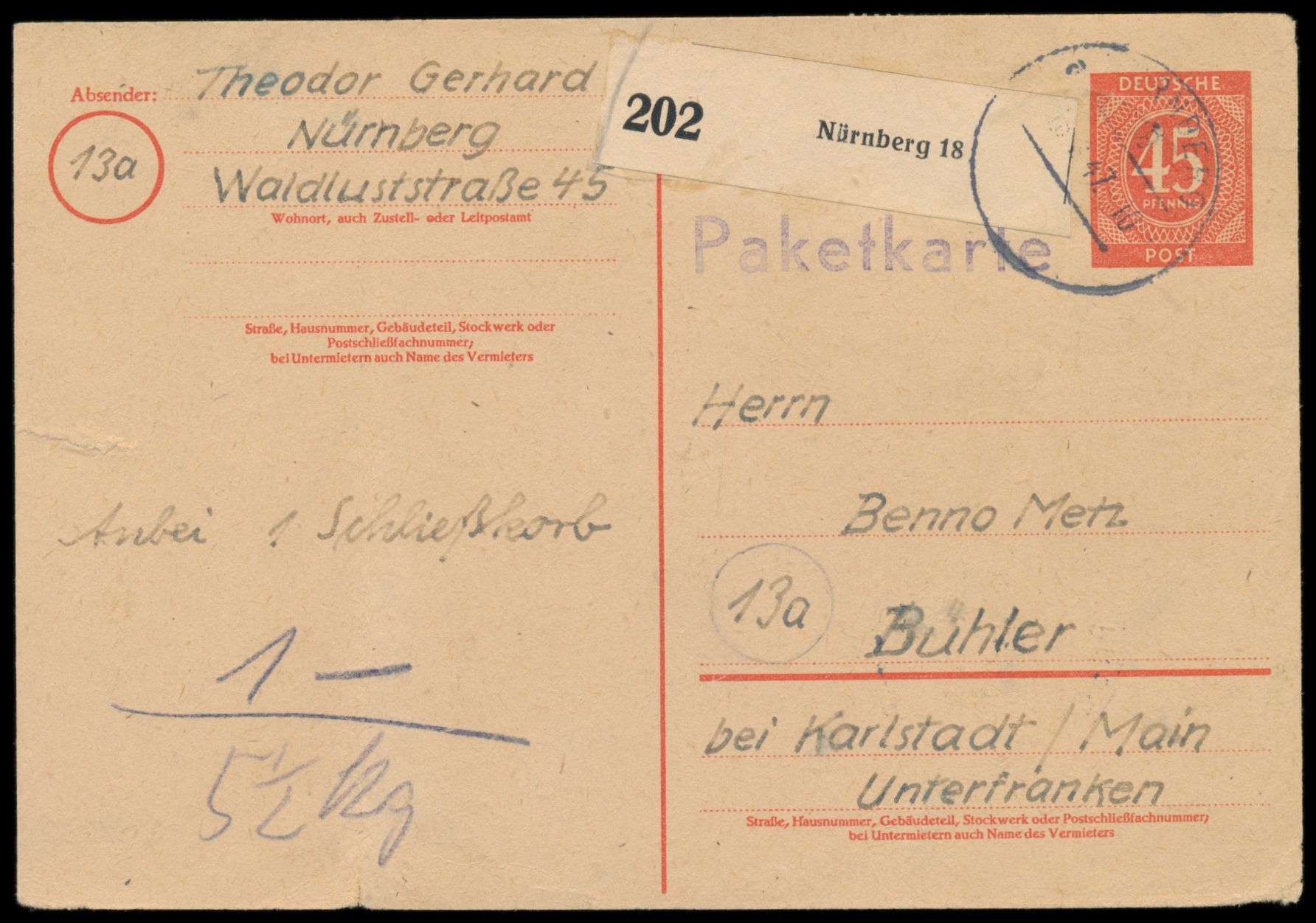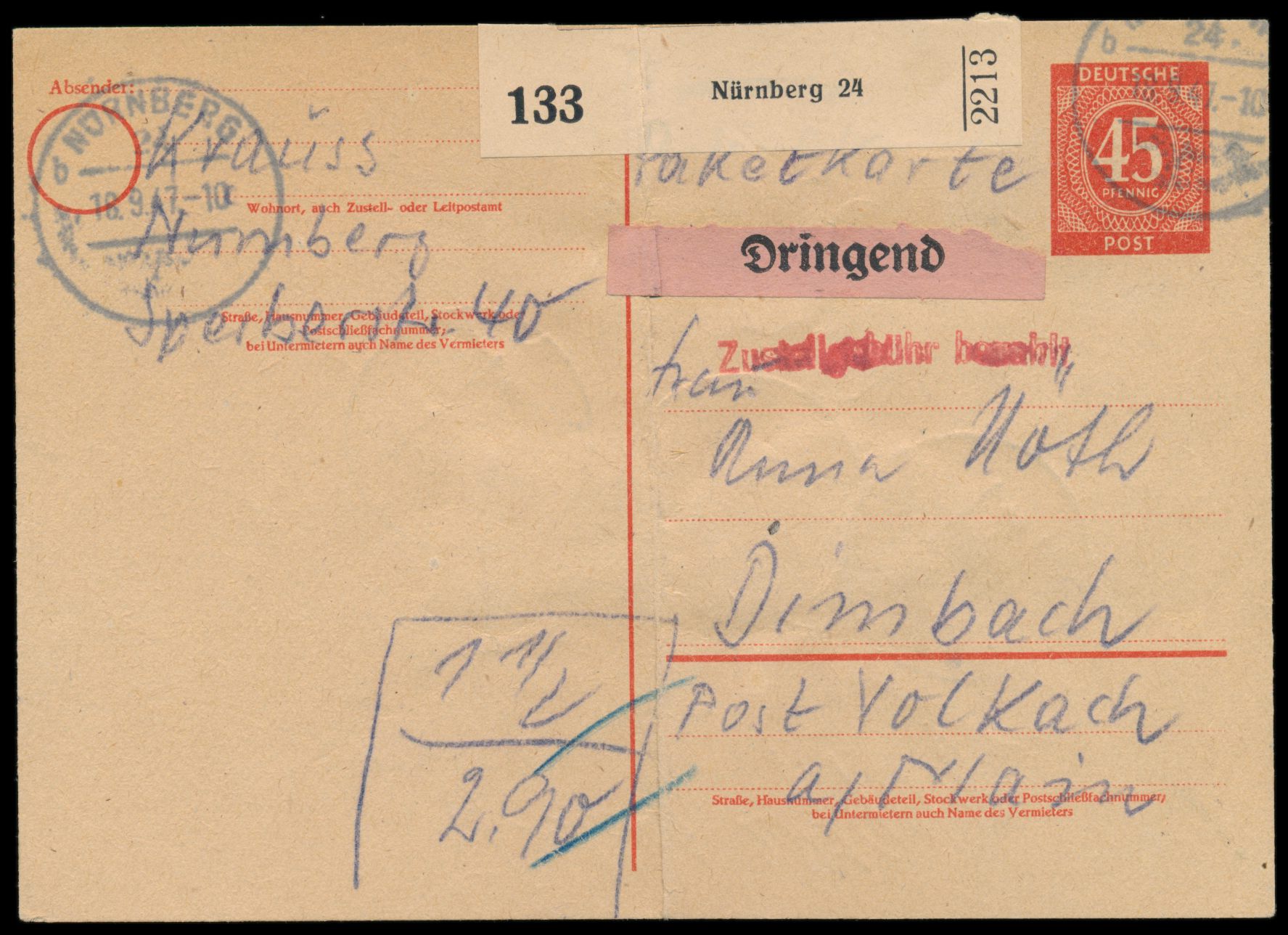 Ganzsache 45 Pf. Ziffer mit viol. Handstempel "Paketkarte" von Nürnberg 3 als Notpaketkarte mit Aufgabestempel Nürnberg 18 18.8.47 verwendet, rückseitig 2 x 10 Pf., 15 Pf. und 20 Pf. Ziffer als Portoergänzung, für ein Paket nach Bühler bei Karlstadt, Porto 1 M., handschriftlicher Zustellvermerk 20.8.47, komplett, links 1 cm Riss, übliche leichte Beförderungsspuren