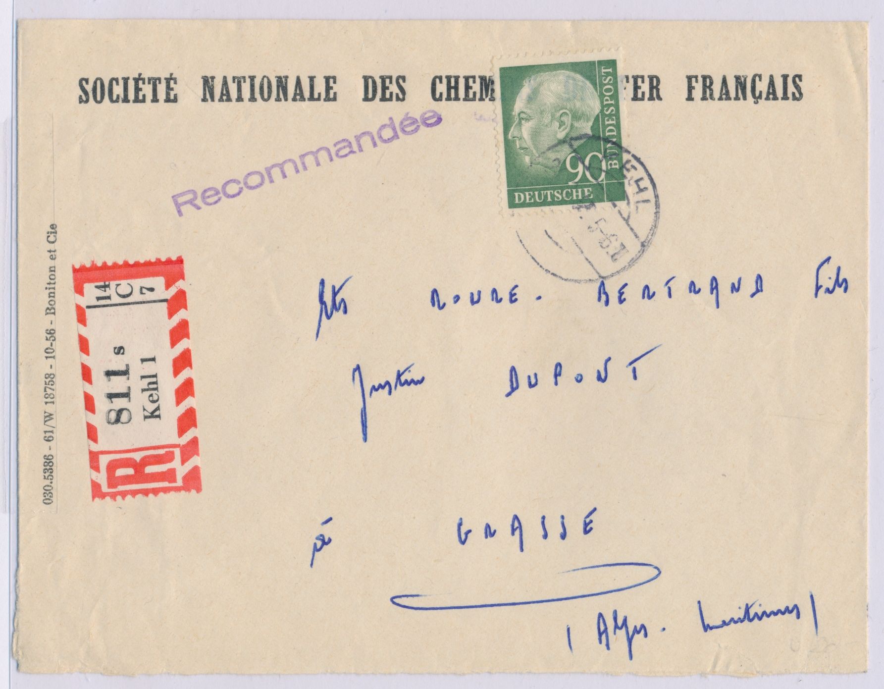 Einzelfrankatur 90 Pf. Heuss auf Auslands-Einschreibbrief mit Stempel Kehl 24.9.57 (Stempelveteran) nach Frankreich, Umschlag der "Societe Nationale des Chemins de fer Francais", rückseitig Absenderstempel "Agence en Douane S.N.C.F. a Kehl ...", Ankunftstempel Grasse 26.9.57, Bedarf