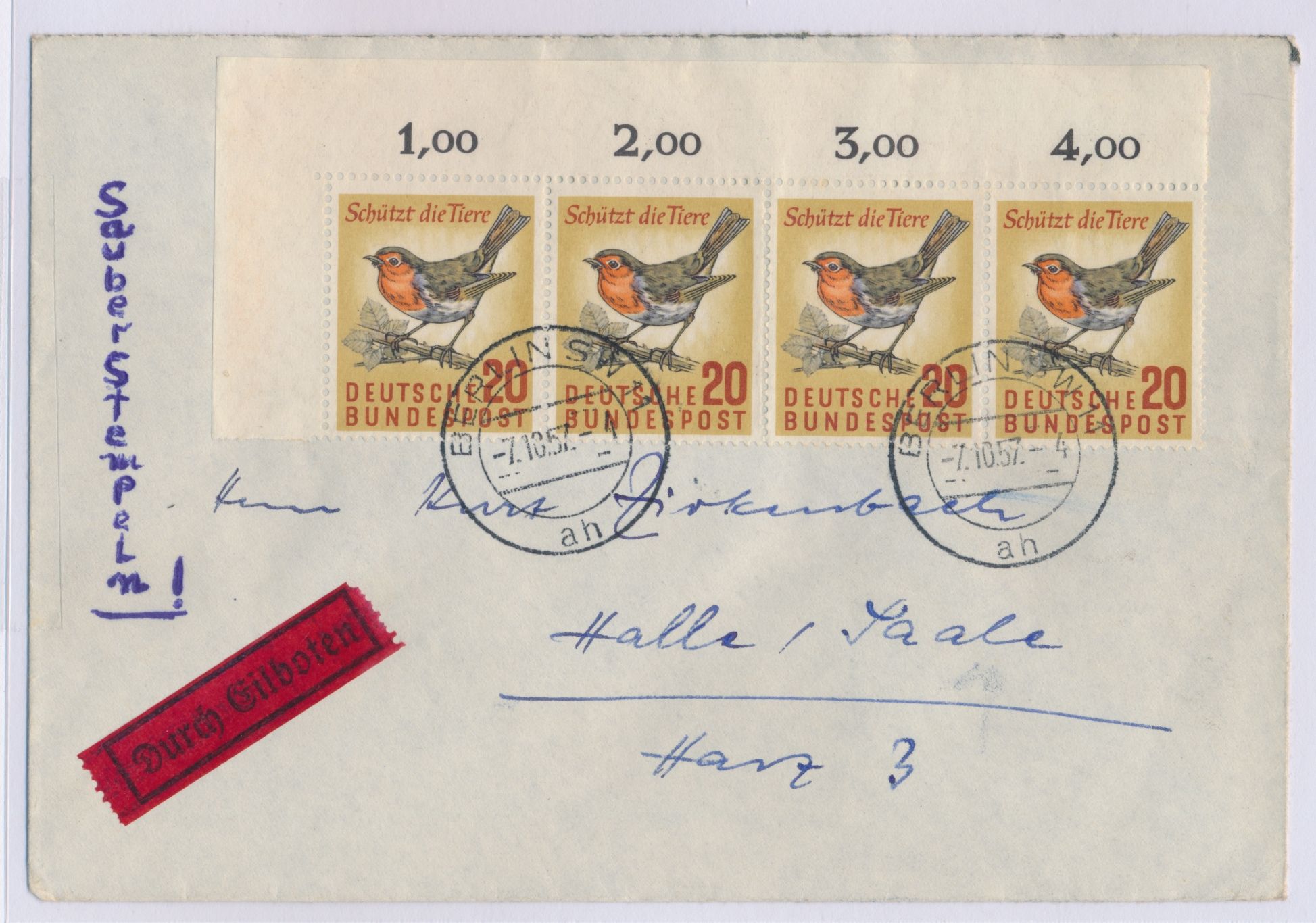 20 Pf. Naturschutz als waagerechter Eckrandviererstreifen links oben auf Eilbotenbrief mit Stempel Berlin SW 11 7.10.57 nach Halle (Saale), Ankunftstempel 8.10.57, portorichtig