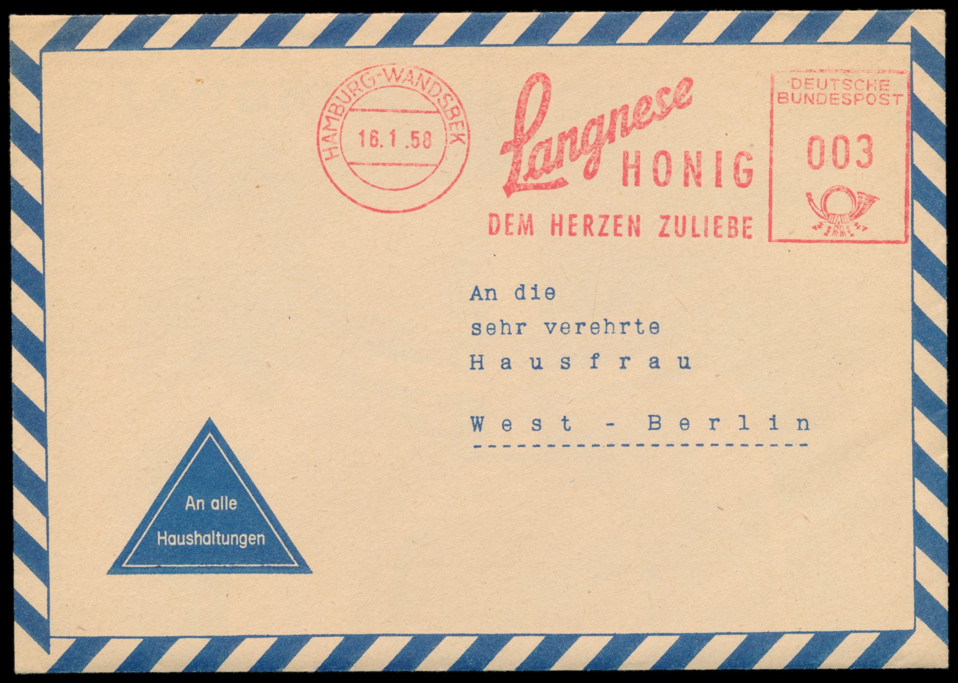 Postwurfsendung "An die sehr verehrte Hausfrau in West-Berlin" mit Absenderfreistempel Langnese Honig, Hamburg-Wandsbek 16.1.58, Wertziffer 003 Pf.