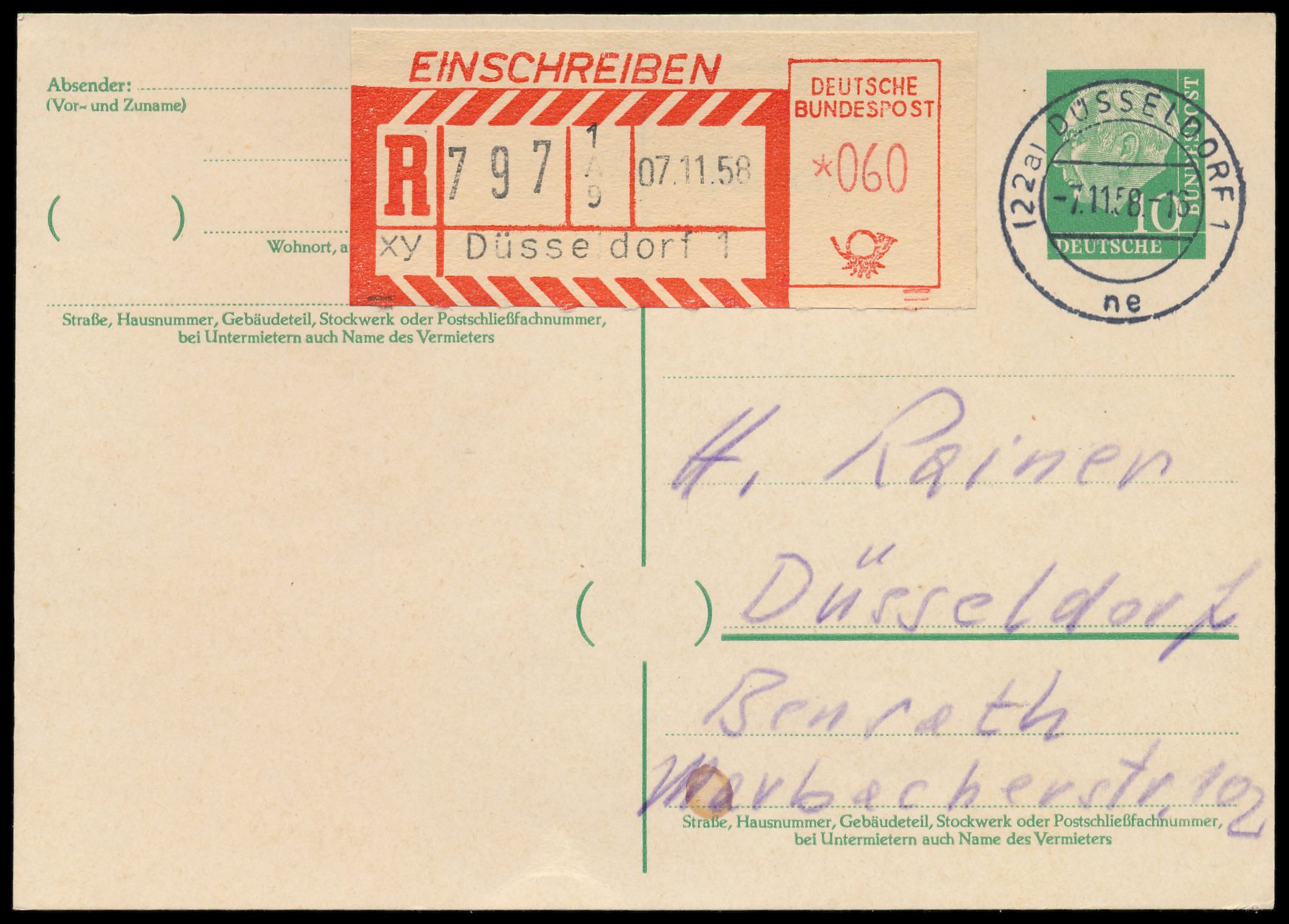 1. Automaten-Versuchs-Einschreibzettel im Freistempelmuster: Ganzsache 10 Pf. mit Versuchs-R-Zettel Düsseldorf 1 mit Nr. 797 und Wertstellung *060, Stempel Düsseldorf 1 7.11.58, Ortskarte ohne Text