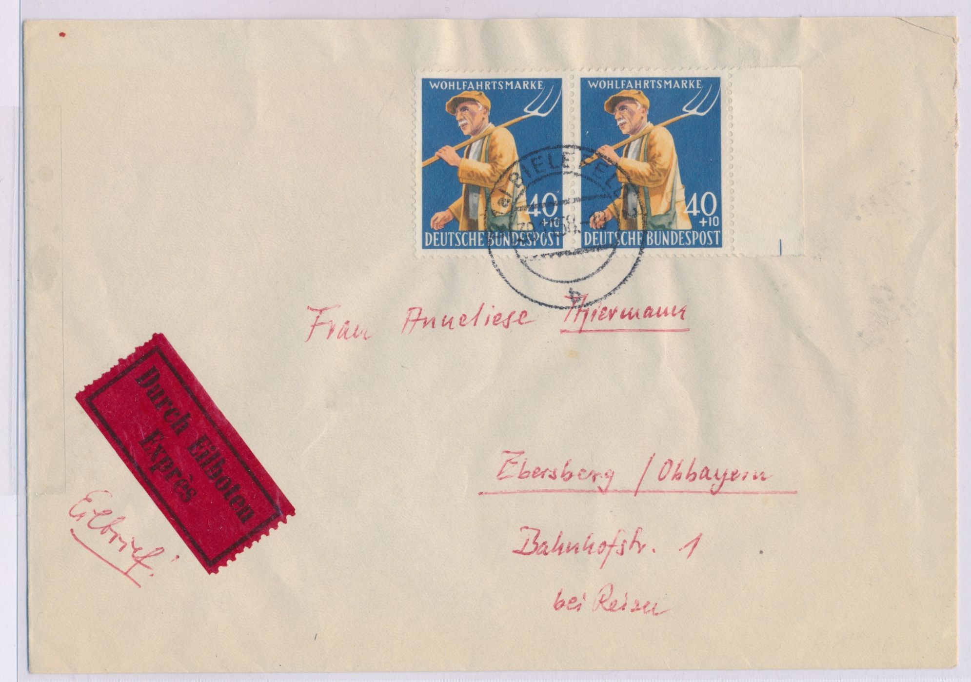 2 x Wohlfahrtsmarke 40 Pf. auf Eilbrief mit Stempel Bielefeld 2 30.11.58 nach Ebersberg, Ankunftstempel 2.12.58, portorichtig, Bedarf