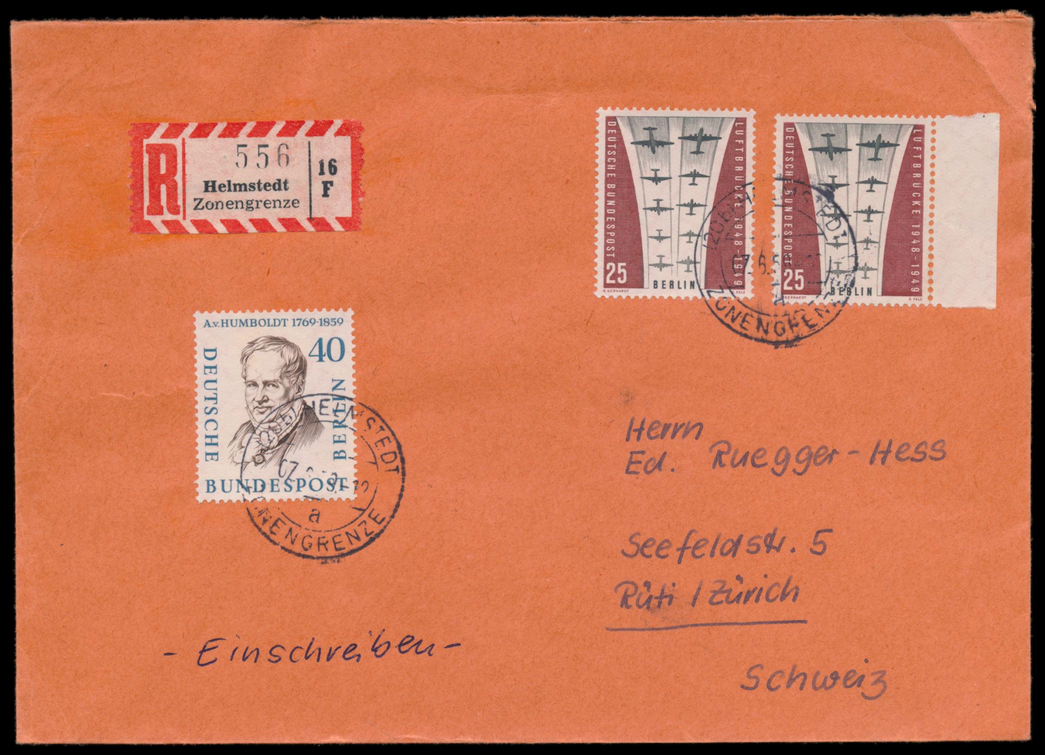 Stempel (20b) Helmstedt Zonengrenze 7.6.59 auf Auslands-R-Brief mit Berlin-Frankatur 90 Pf. in die Schweiz, Absender aus Berlin, R-Zettel Helmstedt Zonengrenze, Ankunftstempel Rüti 8.6.59