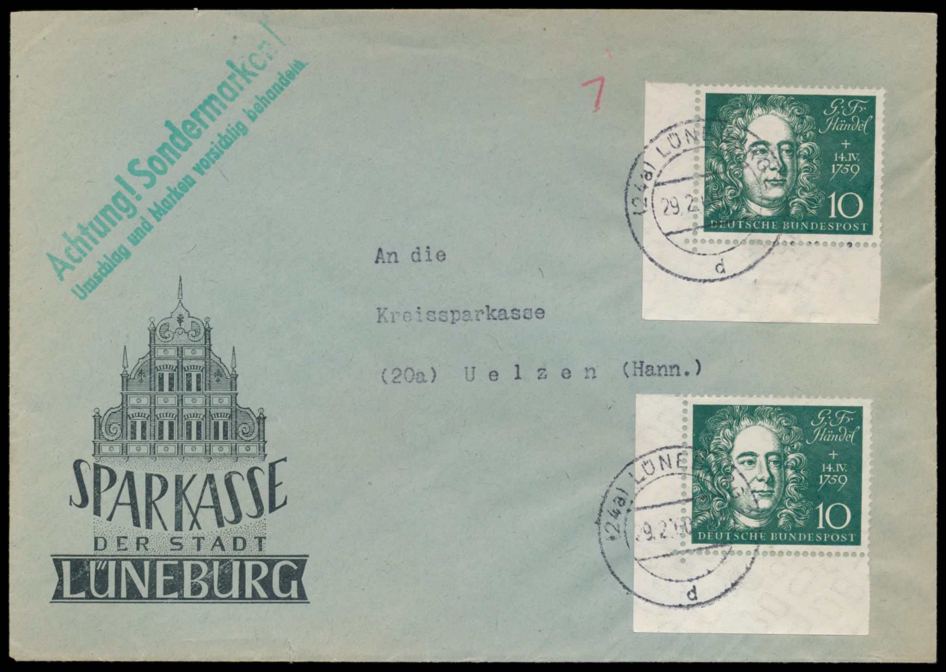 2 x Blockmarke 10 Pf. Bach auf Brief der Sparkasse Lüneburg mit Stempel Lüneburg 2 29.2.60 an die Kreissparkasse in Uelzen, portorichtig, Bedarf