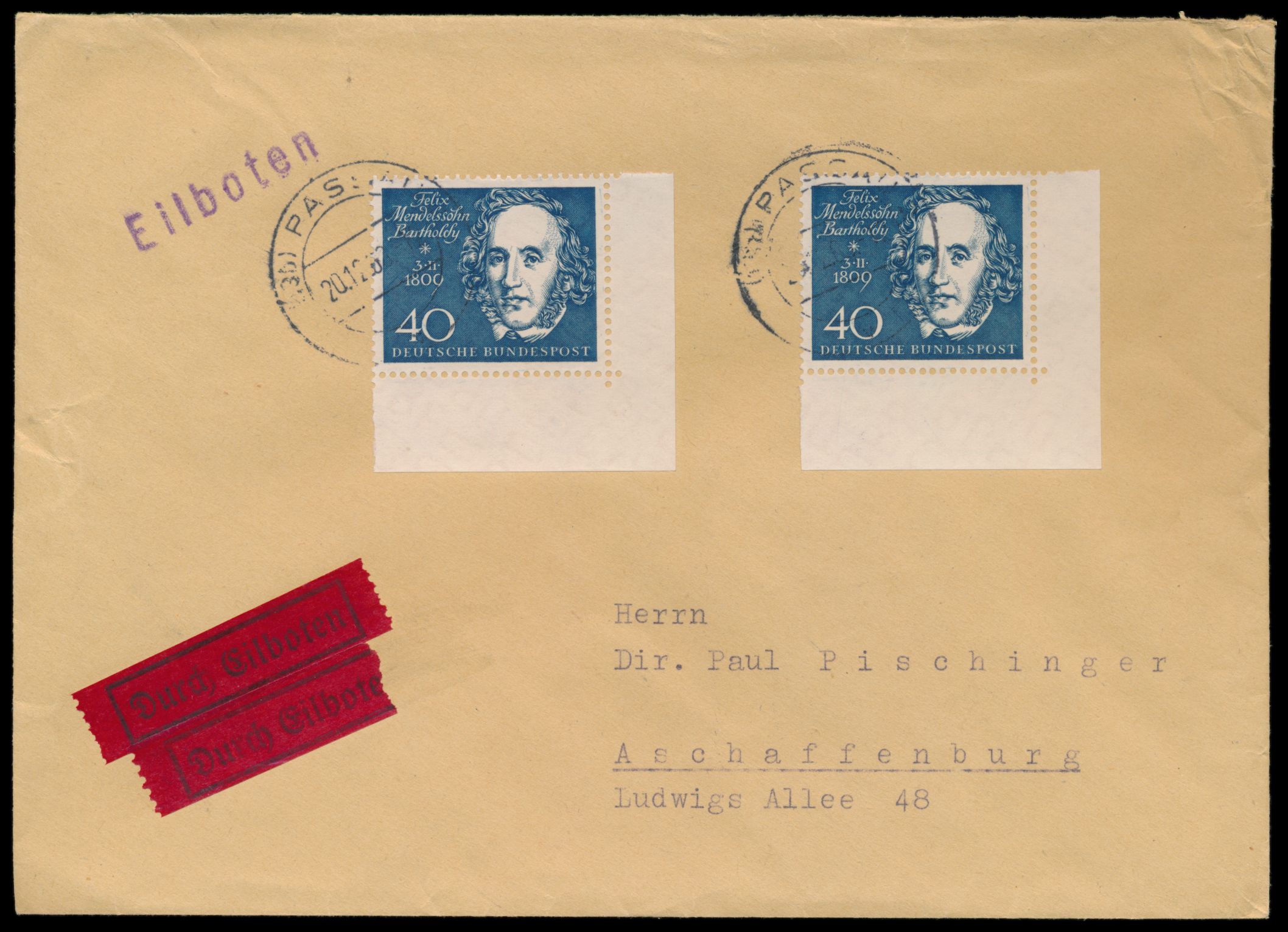 2 x Blockmarke 40 Pf. Mendelsohn-Bartholdy auf Eilbotenbrief mit Stempel Passau 2 20.12.60 nach Aschaffenburg, Durchgangsstempel "0657 / 20." der Bahnpost, portorichtig