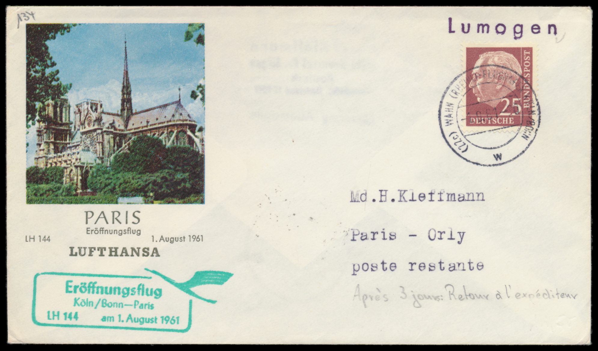Einzelfrankatur 25 Pf. Heuss-Lumogen auf Luftpost-Drucksache nach Paris, Stempel Wahn (Rheinl.) - Flughafen Köln / Bonn 1.8.61, LH-Eröffnungsflug Köln / Bonn - Paris, grüner Bestätigungsstempel und Sonderumschlag, portorichtig, MiPr. 380