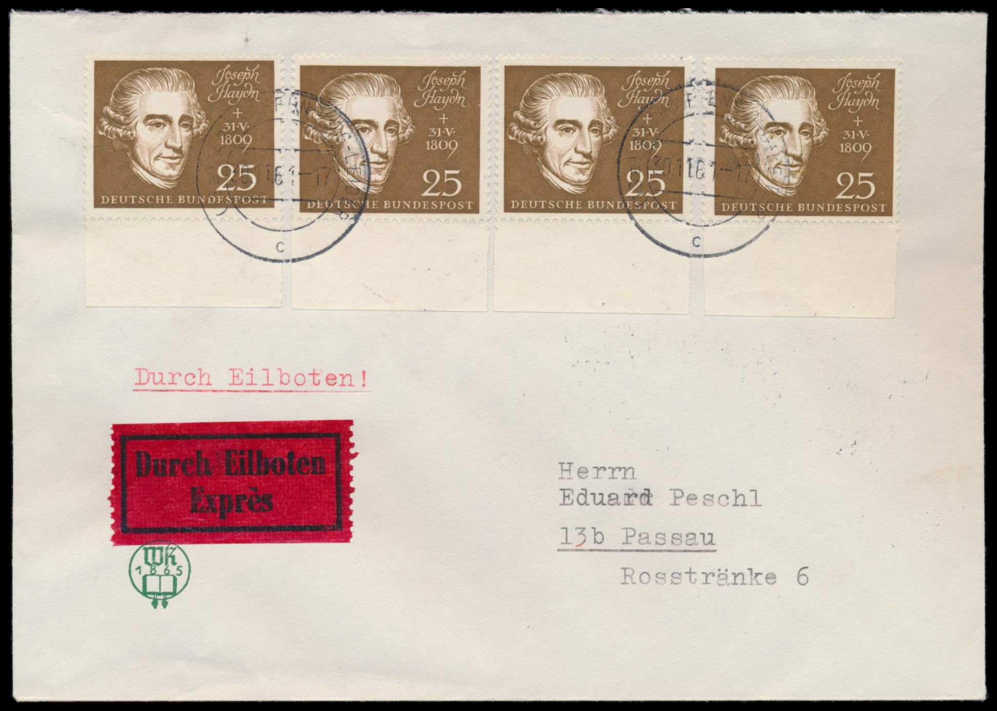 4 x Blockmarke 25 Pf. Haydn auf Eilbotenbrief 2. Gewicht mit Stempel Aschaffenburg-Leider 30.11.61 nach Passau, Durchgangsstempel Aschaffenburg 2 30.11.61, Ankunftstempel Passau 2 1.12.61, portorichtig