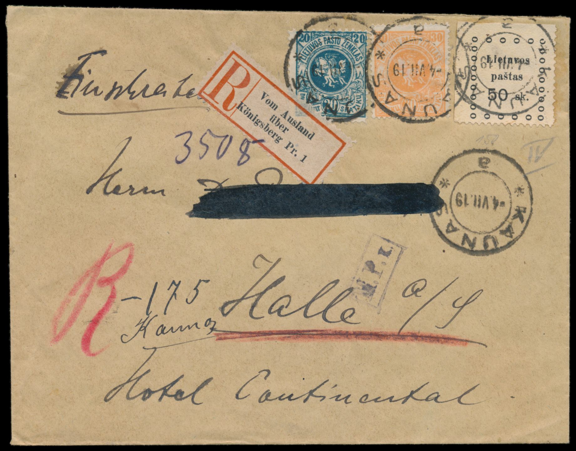 Kaunas-Ausgabe 50 sk mit Wappen 20 sk und 30 sk auf Einschreibbrief nach Deutschland, Stempel Kaunas 4.7.19, handschriftlicher Einschreibvermerk, deutscher R-Zettel "Vom Ausland über Königsberg Pr. 1" und Zensurstempel M.P.k. von Königsberg, Ankunftstempel Halle 8.7.19, Empfängername geschwärzt