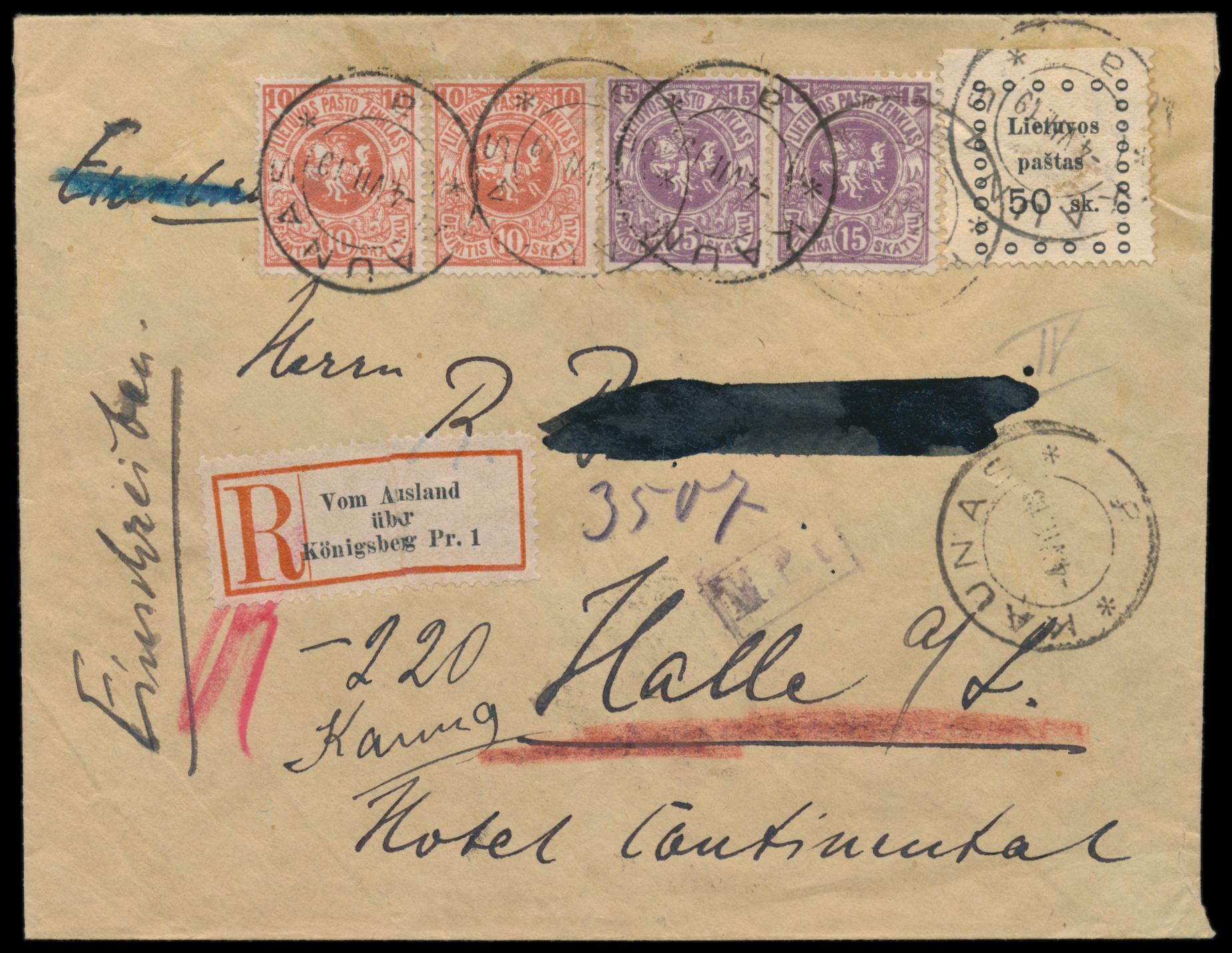 Kaunas-Ausgabe 50 sk mit Wappen 2 x 10 sk und 2 x 15 sk auf Einschreibbrief nach Deutschland, Stempel Kaunas 4.7.19, handschriftlicher Einschreibvermerk, deutscher R-Zettel "Vom Ausland über Königsberg Pr. 1" und Zensurstempel M.P.k. von Königsberg, Ankunftstempel Halle 8.7.19, Empfängername geschwärzt