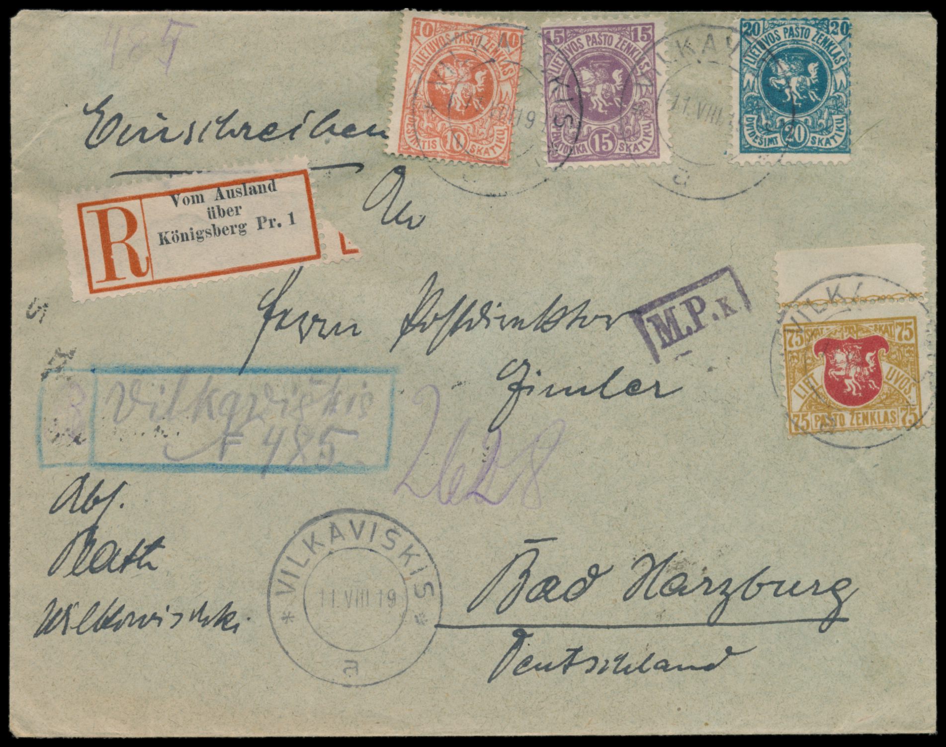 Wappen-Ausgabe 10 sk, 15 sk, 20 sk und 75 sk auf Einschreibbrief nach Deutschland, Stempel Vilkaviskis 11.8.19, handschriftlicher R-Vermerk , deutscher R-Zettel "Vom Ausland über Königsberg Pr. 1" und Zensurstempel M.P.k. von Königsberg, Ankunftstempel Bad Harzburg 16.8.19, Bedarf