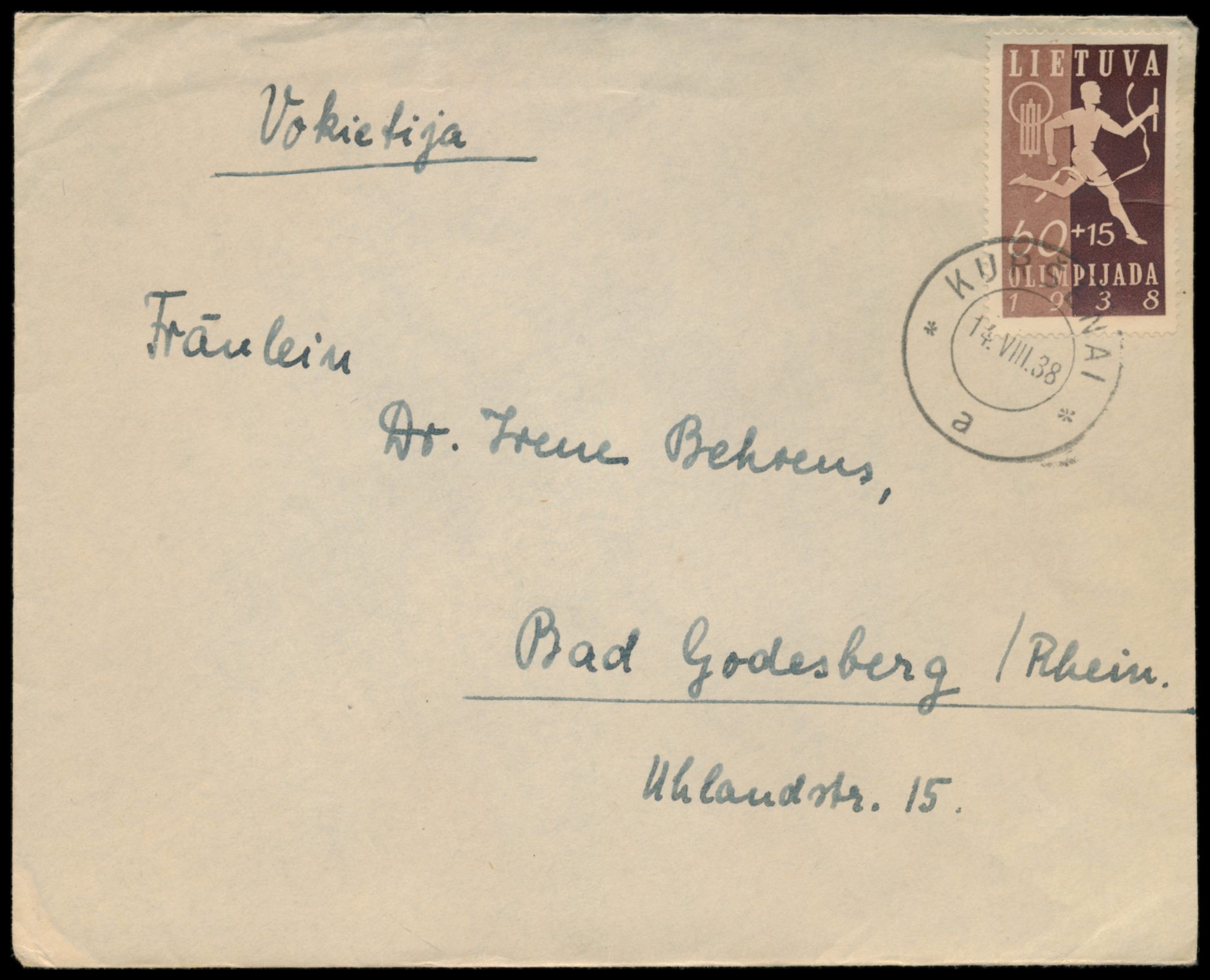 Einzelfrankatur Nationale Sportspiele 60 C. auf Auslandsbrief nach Deutschland, Stempel Kursenai 14.8.38, Bedarf