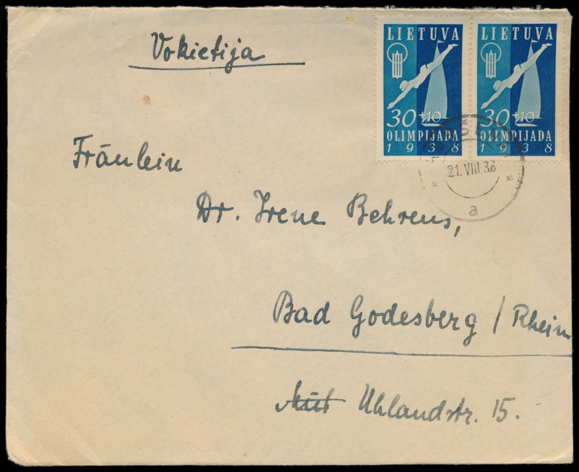 2 x Nationale Sportspiele 30 C. auf Auslandsbrief nach Deutschland, Stempel Kursenai 21.8.38, Bedarf
