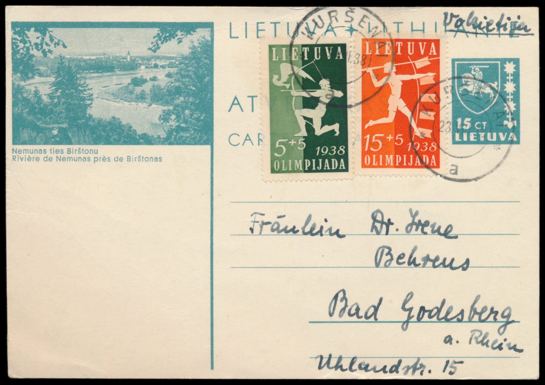 Bildganzsache 15 C. mit Bild Birstonas, Zusatzfrankatur Nationale Sportspiele 5 C. und 15 C., nach Deutschland, Stempel Kursenai 28.8.38, portorichtig, Bedarf