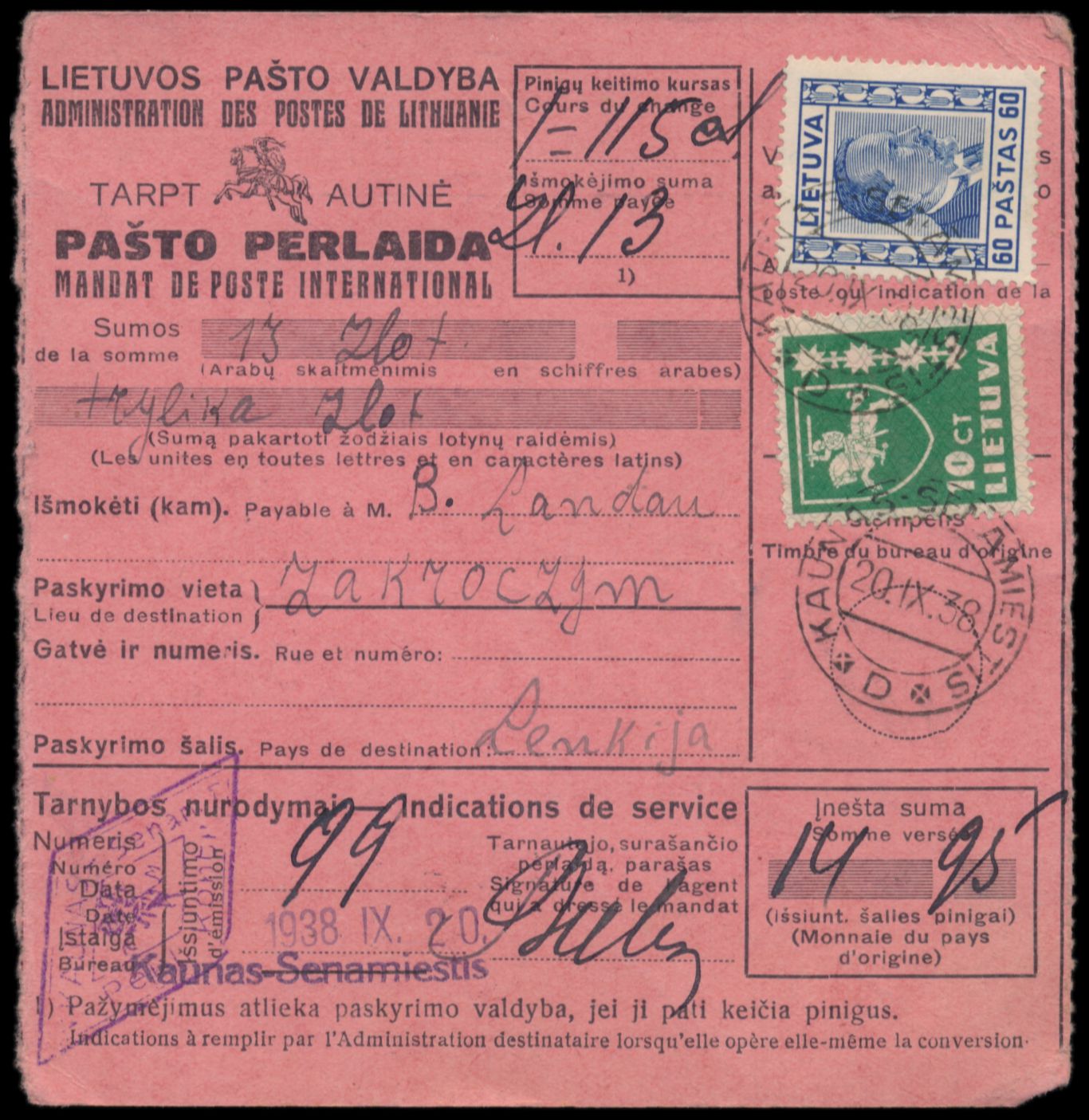 10 C. Wappen und 60 C. Smetona auf Internationaler Postanweisung auf 13 Zl. nach Polen, Stempel Kaunas - Semamiestis 20.9.38, Ankunftsstempel Zakoroczym 24.9.38