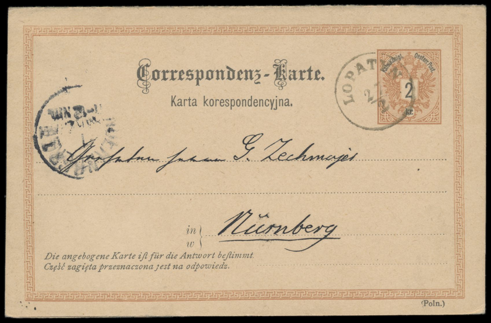 seltene Ganzsachen-Doppelkarte 2 Kr. "Doppeladler" mit Zierumrandung (Ausgabe 1890), Stempel Lopatyn 27.2., Ankunftstempel Nürnberg, Antwortteil hängt ungebraucht an, Bedarf