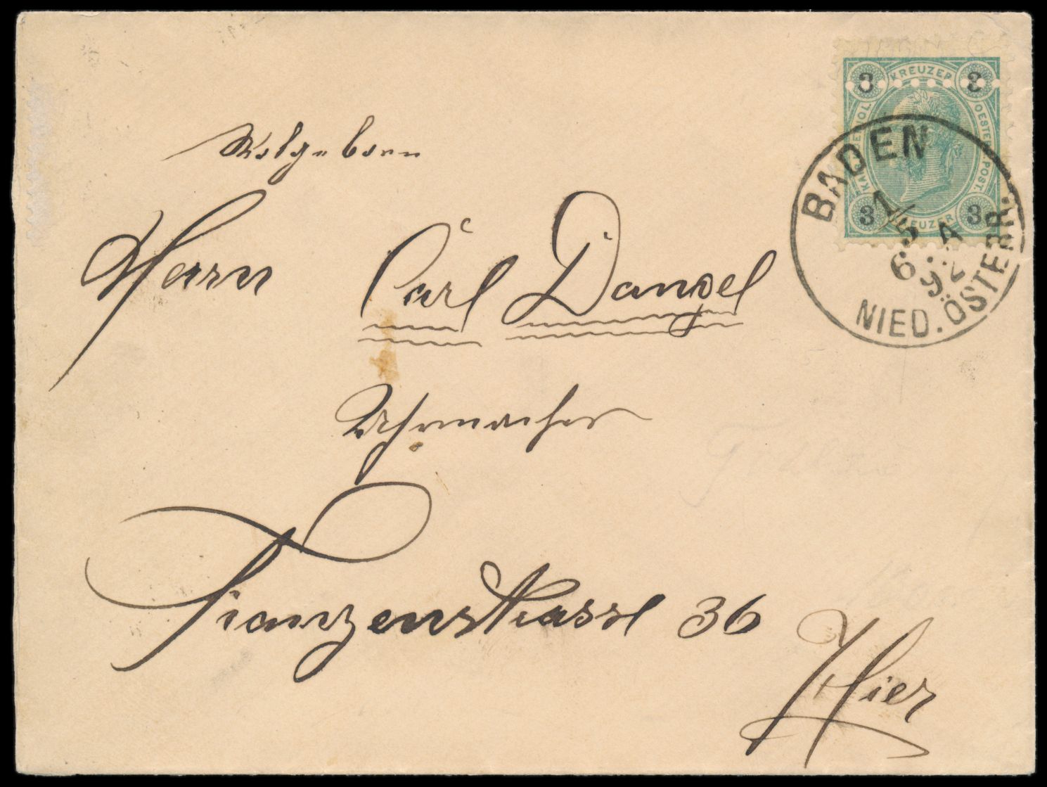 Ausgabe 1890 3 Kr. mit Zähnung L 10 mit waagerechter Doppelzähnung L 10 auf Ortsbrief, Stempel Baden Nied. Österr. 1.5.92