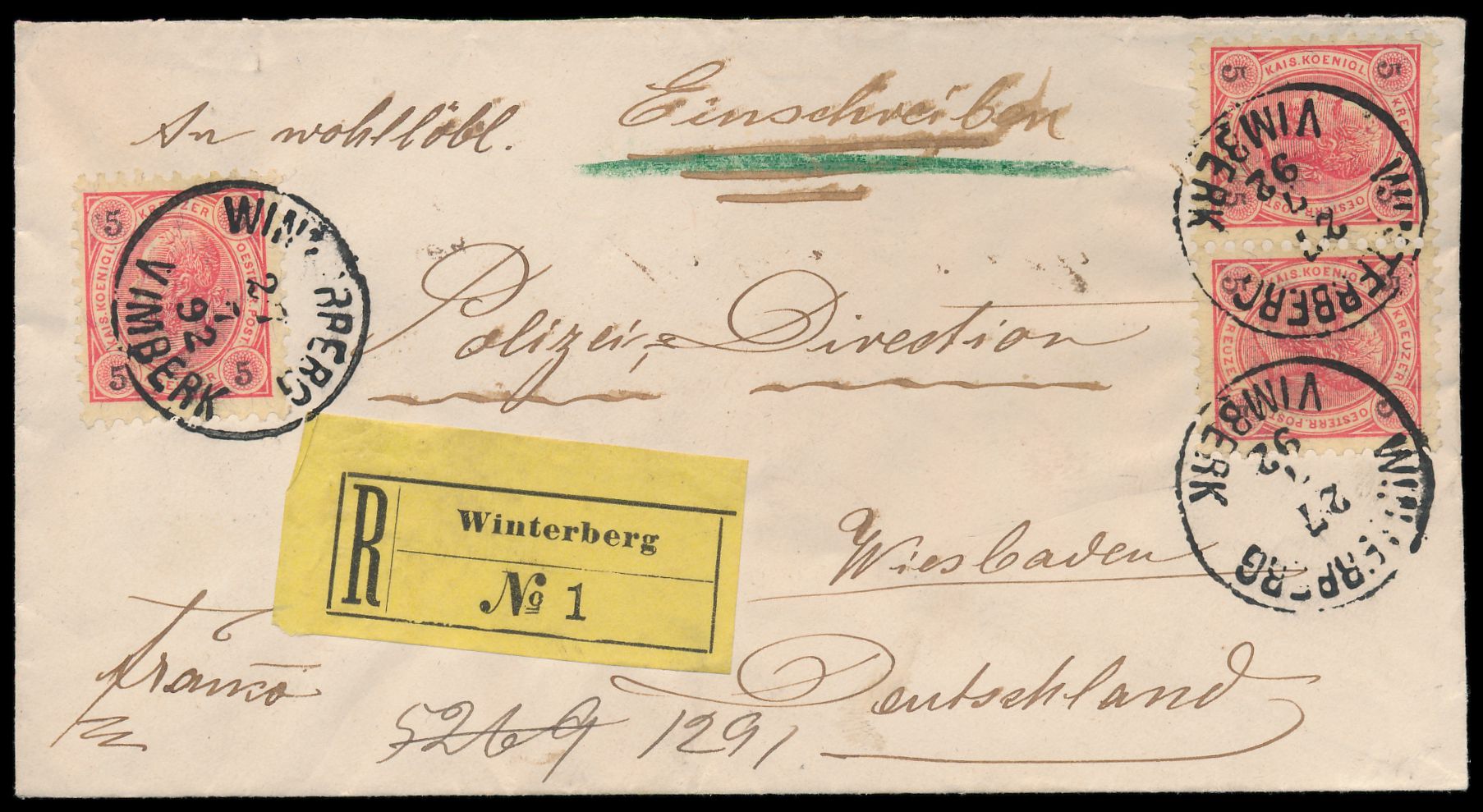3 x 5 Kr. (Ausgabe 1890) auf Reko-Brief mit Stempel Winterberg / Vimberk 27.7.92, ungezähnter R-Zettel für Postmeisterämter "No. 1" , nach Wiesbaden, Ankunftstempel 29.7.92