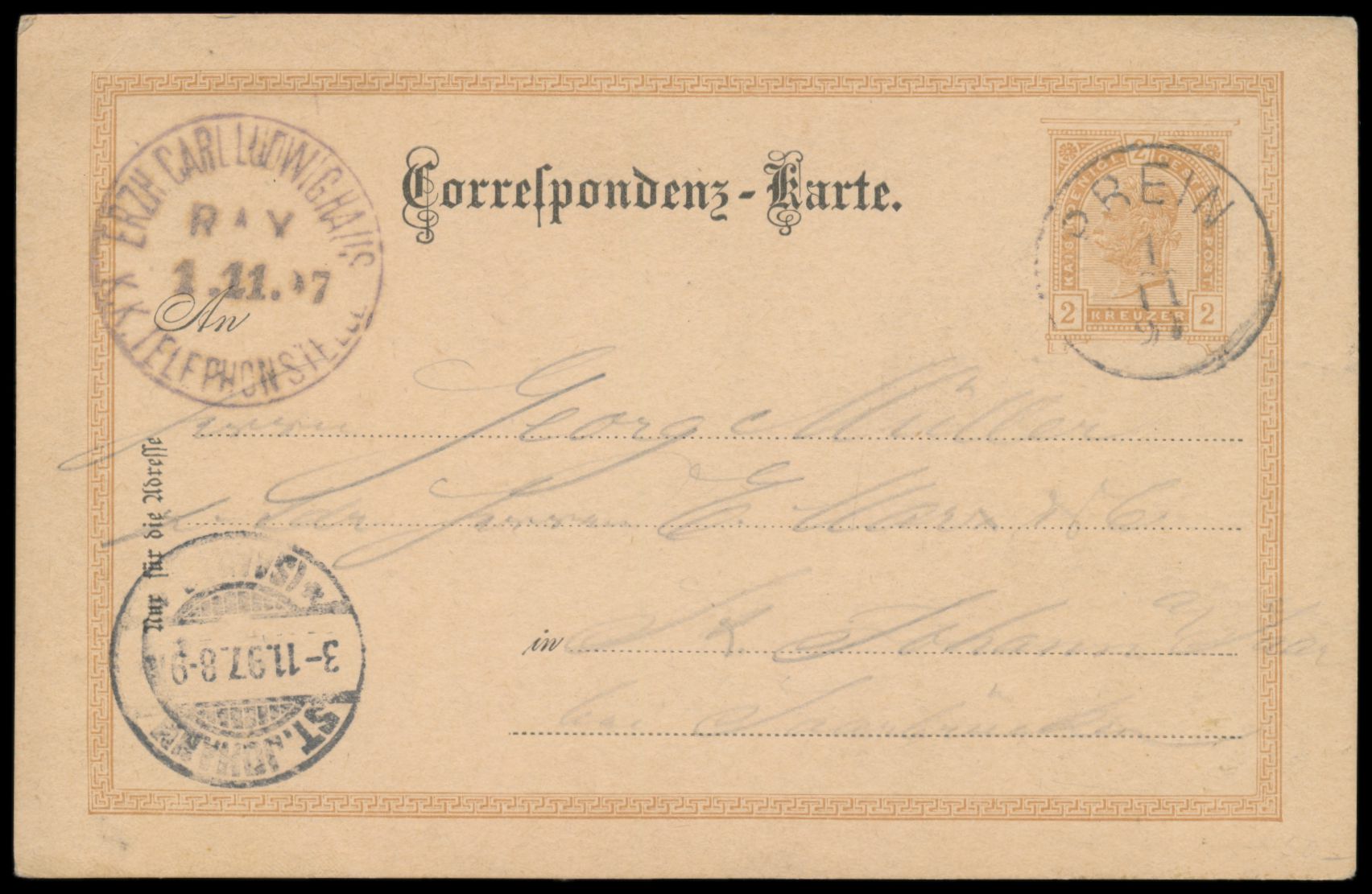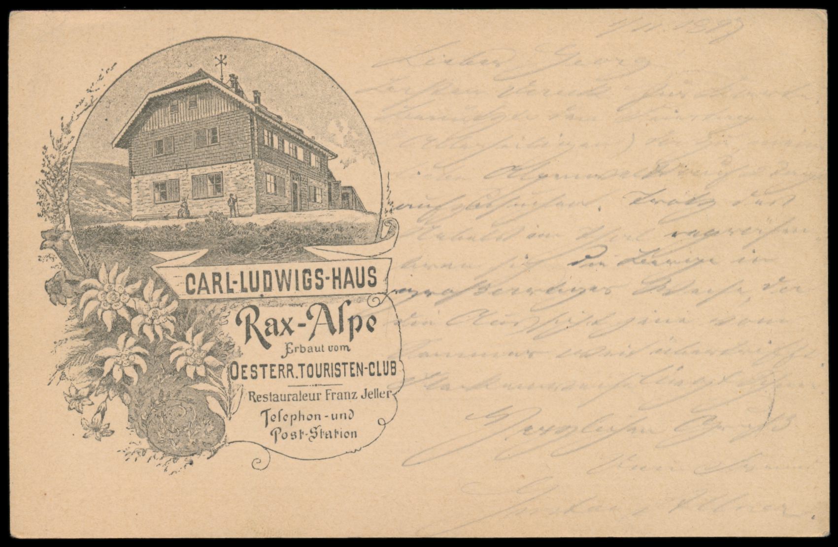 Ganzsache 2 Kr. Kaiser Franz Joseph (1897) mit rückseitigem Bildzudruck "Carl-Ludwig-Haus - Rax-Alpe ..." , Postablagestempel Erzh. Carl Ludwighaus / Rax / K. k. Telephonstelle 1.11.97 und Stempel Grein 1.1.97, nach Deutschland, Ankunftstempel St. Johann 3.11.97, Bedarf