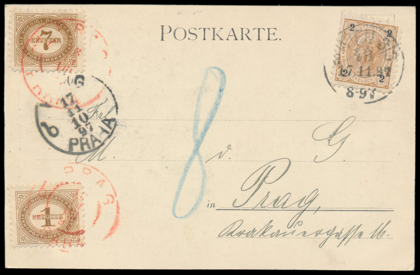 2 Kr. (Ausgabe 1890) mit Stempel Wien 17.11.97 auf Ansichtskarte nach Prag, Nachgebühr 8 Kr., Portomarken 1 Kr und 7 Kr frankiert, roter Stempel Prag 18.11.97, Bedarf