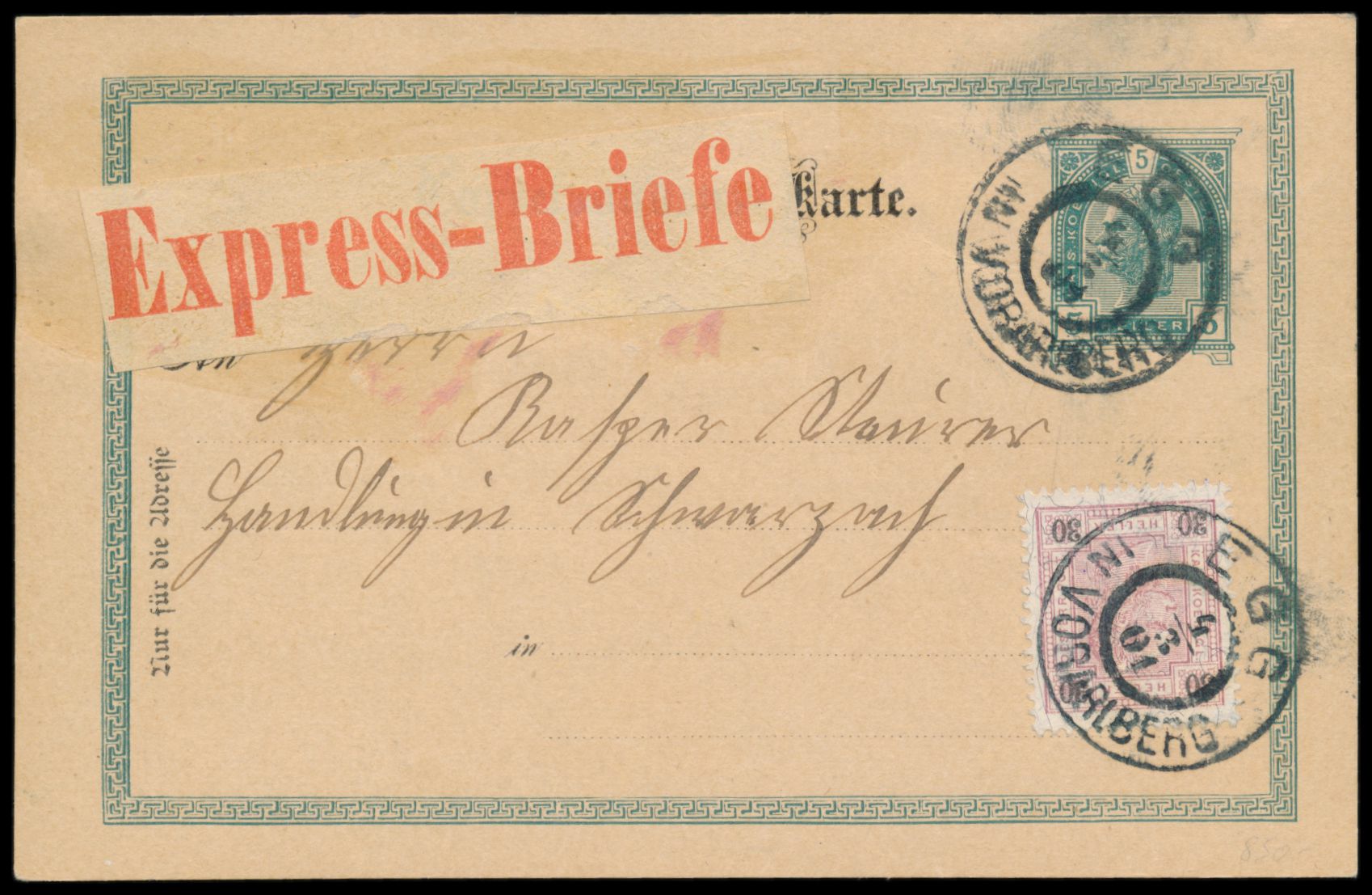 Ganzsache 5 H (1900) mit Zusatzfrankatur 30 H ohne Lackstreifen (1899) als Eilbotenkarte mit Stempel Egg in Vorarlberg 4.3.01 nach Schwarzach, großer Klebezettel "Express-Briefe" , Bedarf