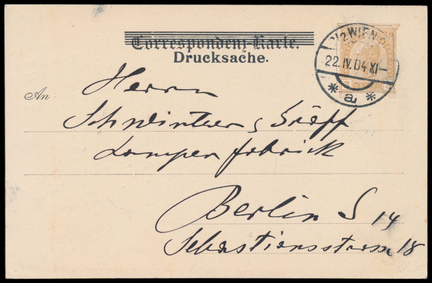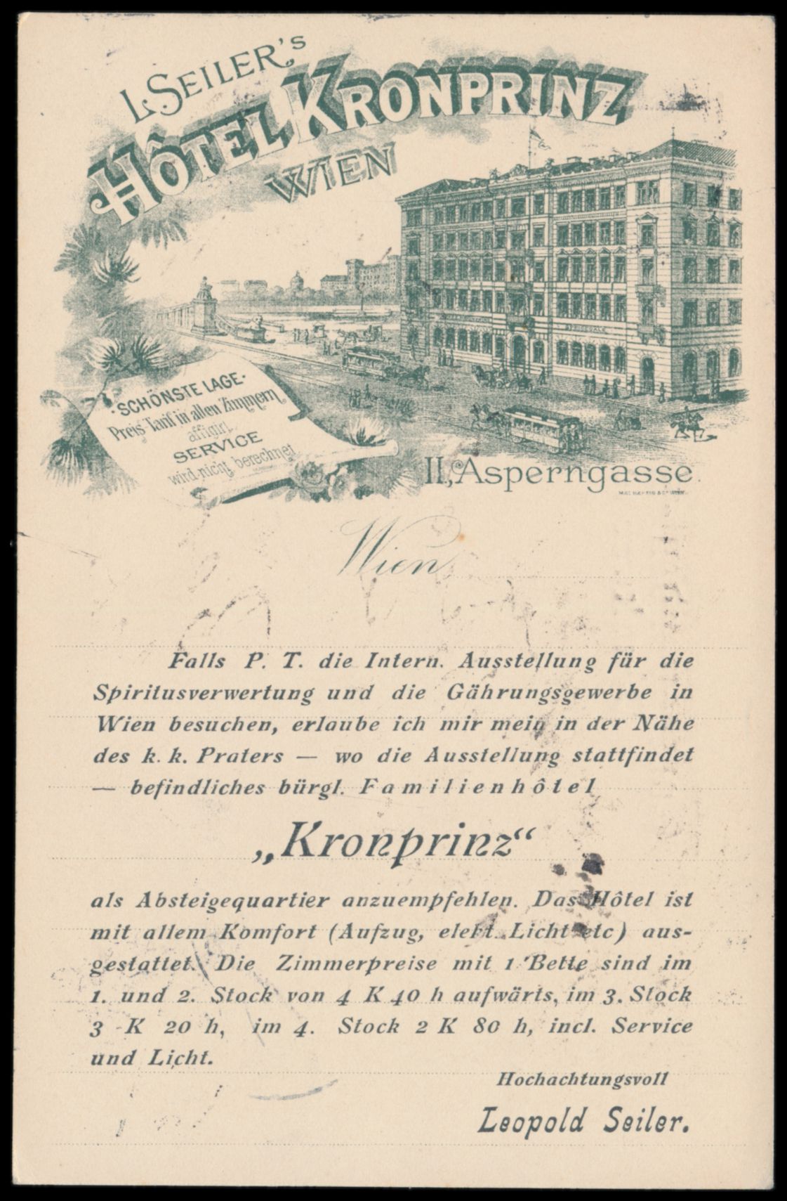 Privatganzsache 3 H. (Torbogenmuster) als Drucksachenkarte mit rückseitigem Bild "L Seiler´s Hotel Kronprinz Wien II, Asperggasse" , Stempel Wien 22.4.04, nach Berlin